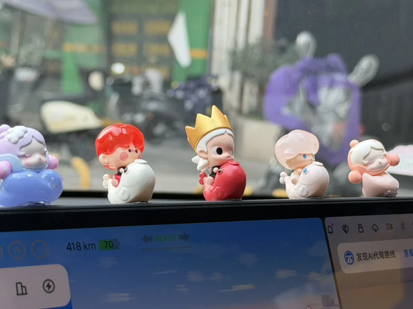 仪表台上的小摆件们是我的专属陪伴:戴着睡帽的Labubu眯着眼打盹,戴着皇冠的小家伙抱着红鱼发呆,还有圆滚滚的PinoJelly排排坐,连空气里都飘着软乎乎的可爱气息。有时我会盯着它们傻笑,有时只是闭着眼,感受空调风轻轻拂过脸颊的温度。