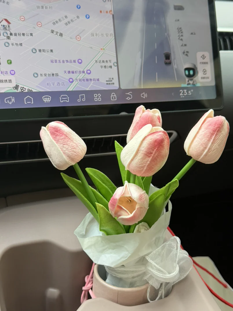 每次停好车,外界的喧嚣仿佛被车门瞬间隔绝。我总会习惯性地赖在座椅上,先打开座椅按摩,再挑一首循环了很久的歌单,让温柔的旋律填满整个座舱。杯架里插着粉白渐变的郁金香,绒布花瓣带着恰好的温柔,像把春天揉进了车厢里。