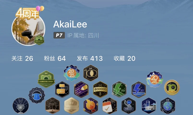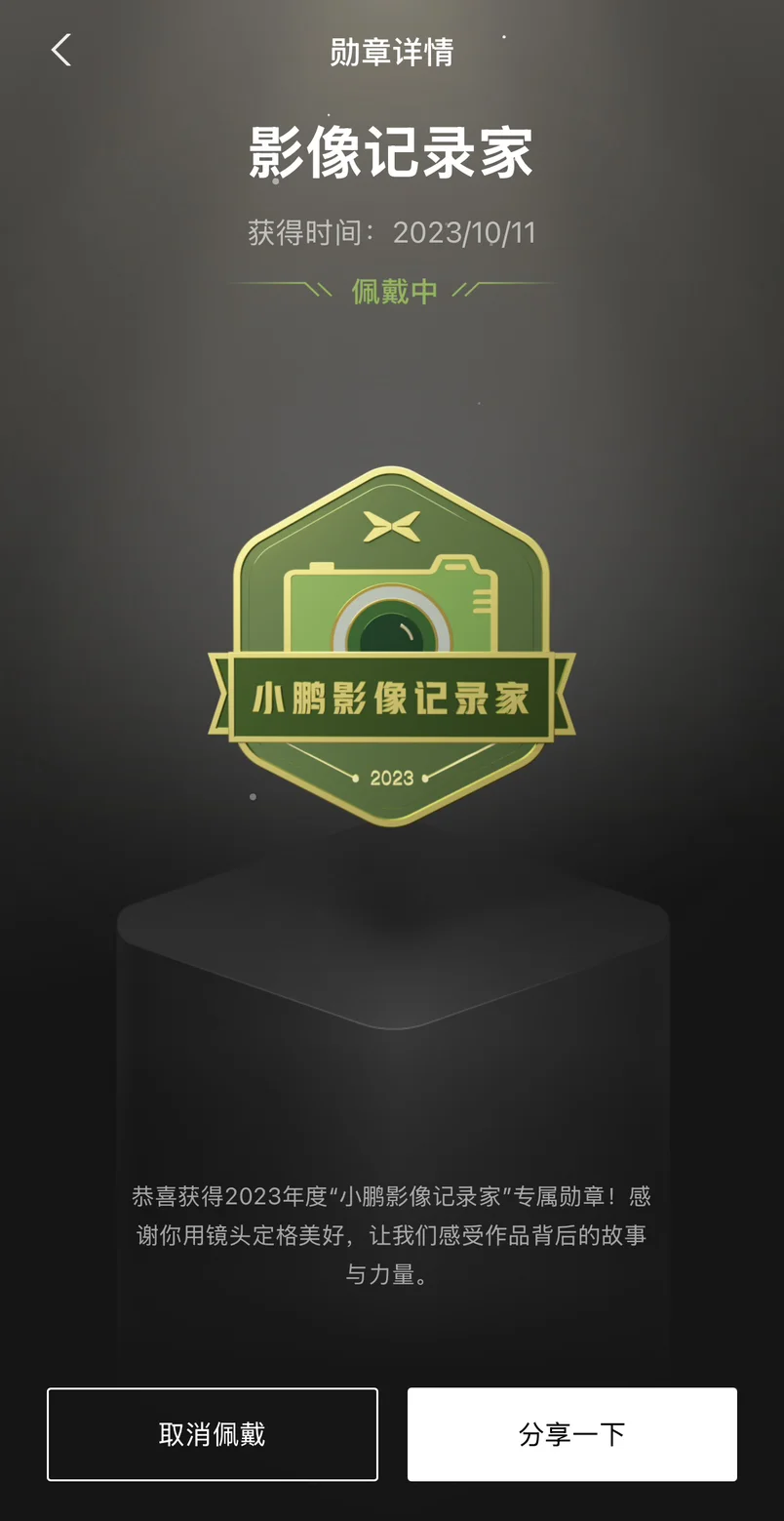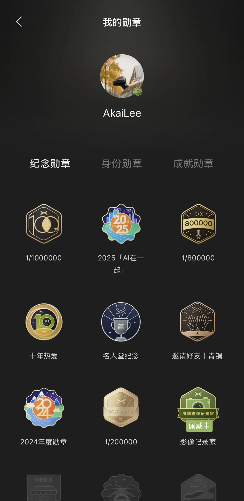 #晒晒我的勋章# 一路走来,我已集齐19枚勋章,从20万分之一到百万分之一,每一枚都见证着与小鹏共同成长的时光。如今佩戴的“小鹏影像记录家”勋章,是2023年在社区摄影活动中所得,用镜头定格热爱,这份专属纪念,意义非凡。