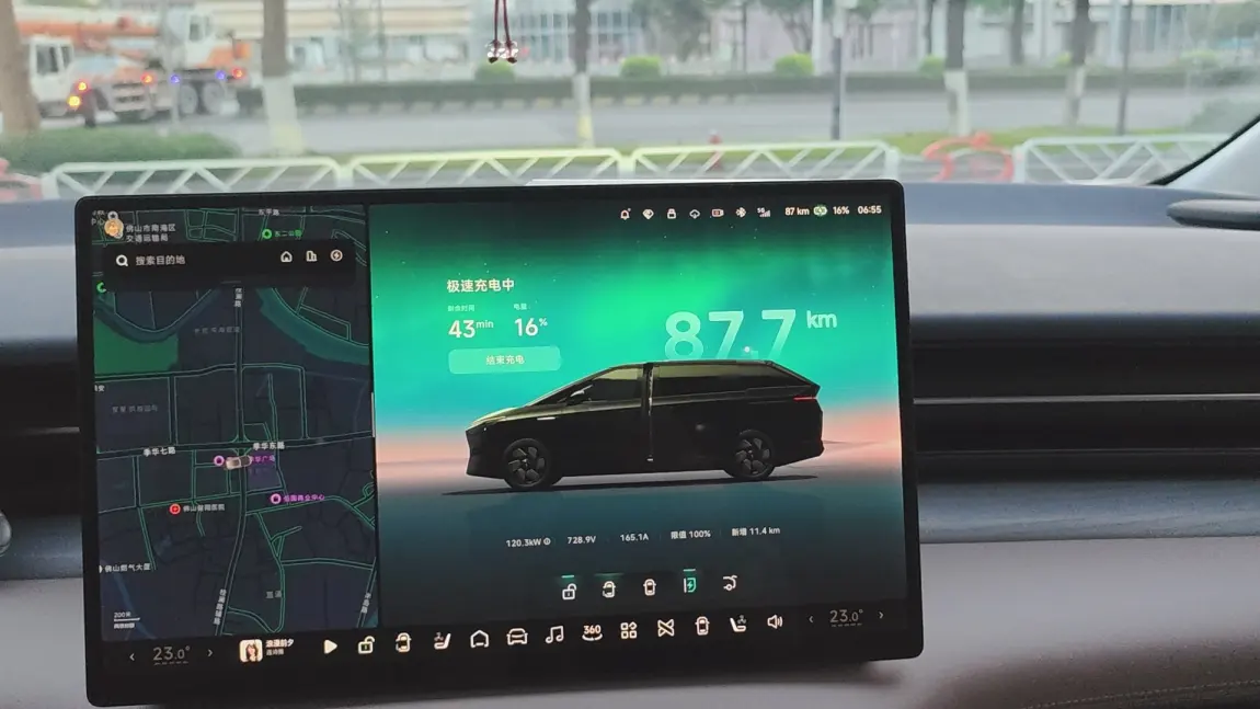 拔下充电枪的那一刻,屏幕亮起「极速充电中」的提示,43分钟的等待,成了我一天里最珍贵的独处时光。车外是佛山清晨微凉的风,偶尔有工程车缓缓驶过,而车内,是完全属于我的小世界。