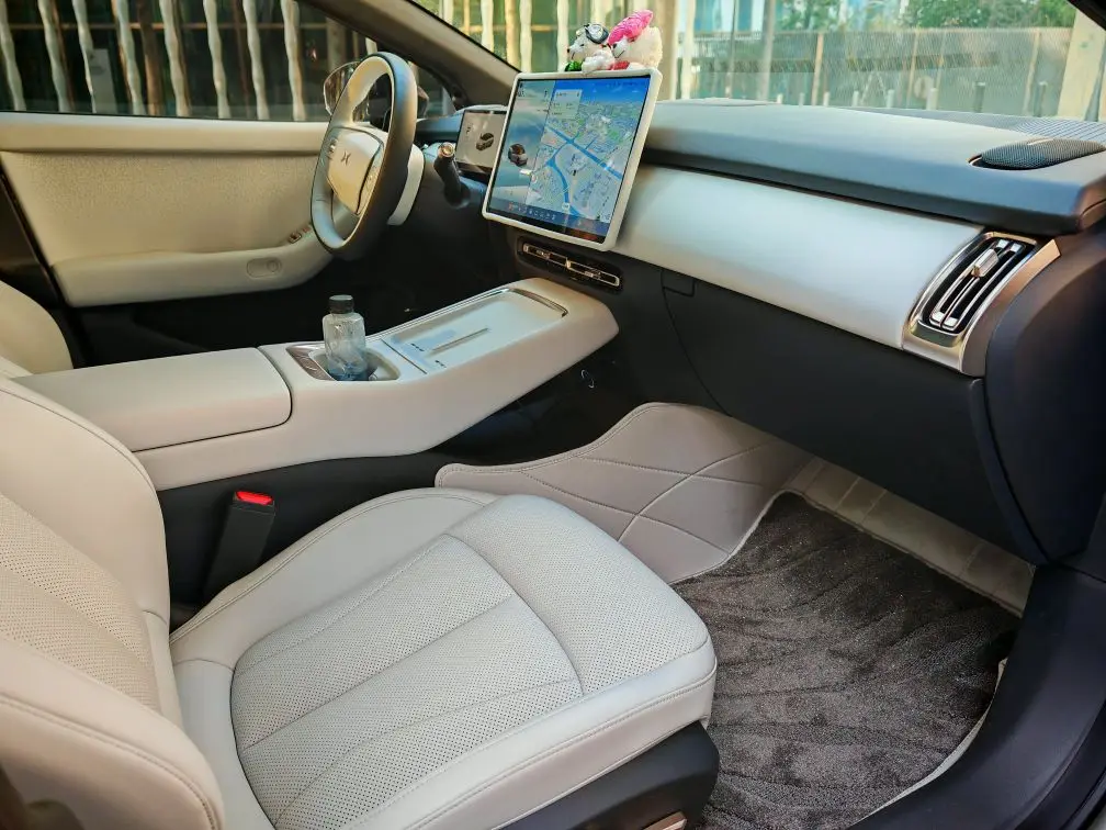 坐进座舱,质感瞬间拉满。Nappa打孔真皮座椅触感细腻,Micro Fiber超纤绒顶棚营造出静谧氛围,256色星瀑式氛围灯随光影流转,与2.1㎡全景天幕相映,抬头是澄澈天光,低头是精致细节 。15.6英寸悬浮中控屏搭配29英寸全场景HUD,导航、车速信息清晰呈现,驾驶时无需低头,科技感与实用性完美融合。