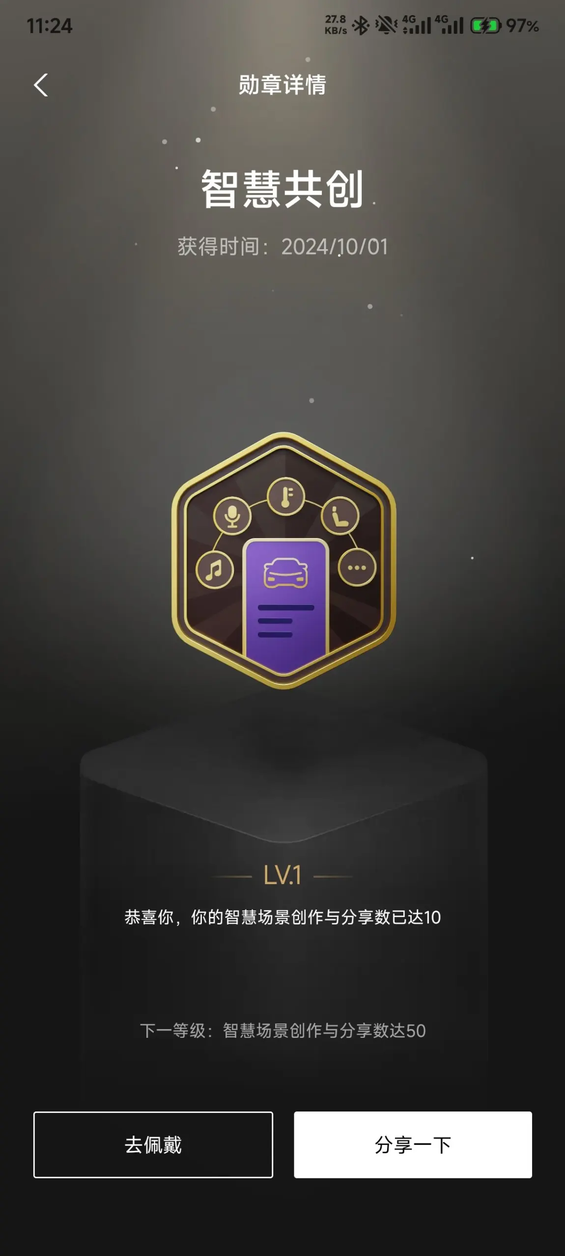 买了小鹏已经两年了,得到了很多勋章,最喜欢的是这个智慧场景的,很开心自己创作的智慧场景被分享,希望大家一起进步!