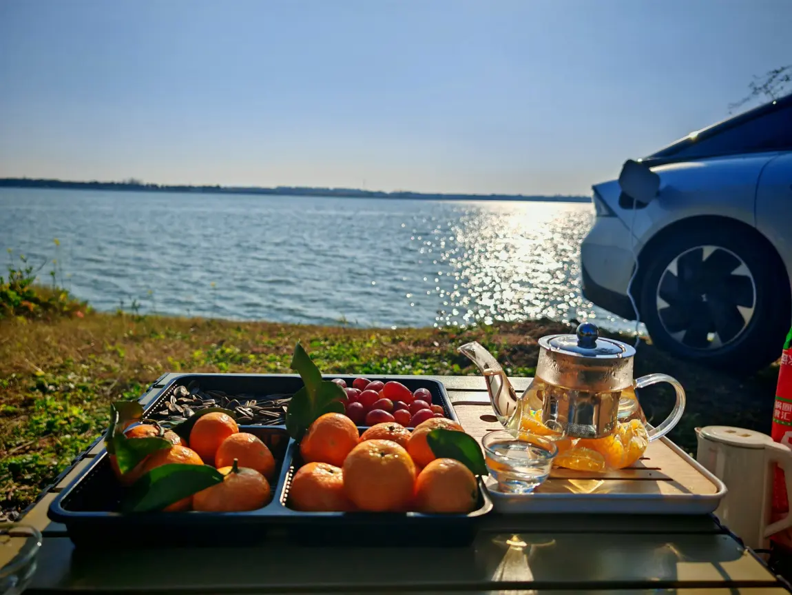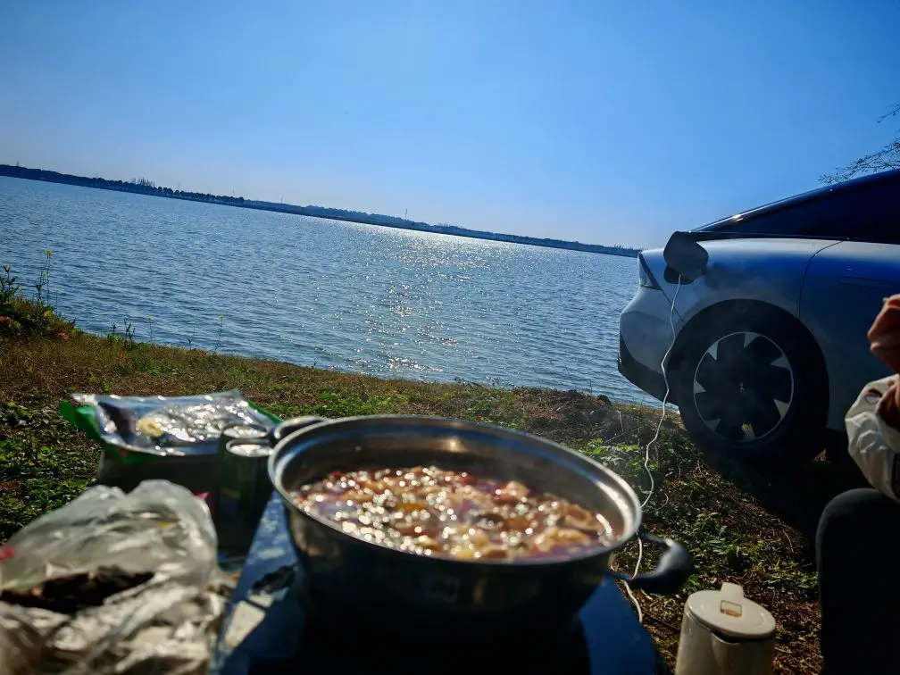 停好车,接上外放电枪,一场湖边火锅局正式开场。咕嘟冒泡的锅底蒸腾起热气,与远处的水天一线撞成温暖的对比。车外是波光粼粼的湖面,车内是恒温舒适的空间,累了就钻进Nappa真皮座椅里小憩,抬头便是澄澈蓝天,连呼吸都变得轻快。