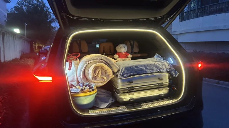 最让我印象深刻的,是帮老婆收拾去杭州培训半年的行李。28寸的行李箱、厚厚的被褥、换洗衣物、洗漱用品,还有她舍不得放下的玩偶,一股脑塞进后备箱,居然还留有余地,不用像以前那样反复堆叠、挤压,轻轻松松就把她半年的生活所需都装下了,关尾门的那一刻,心里满是踏实。