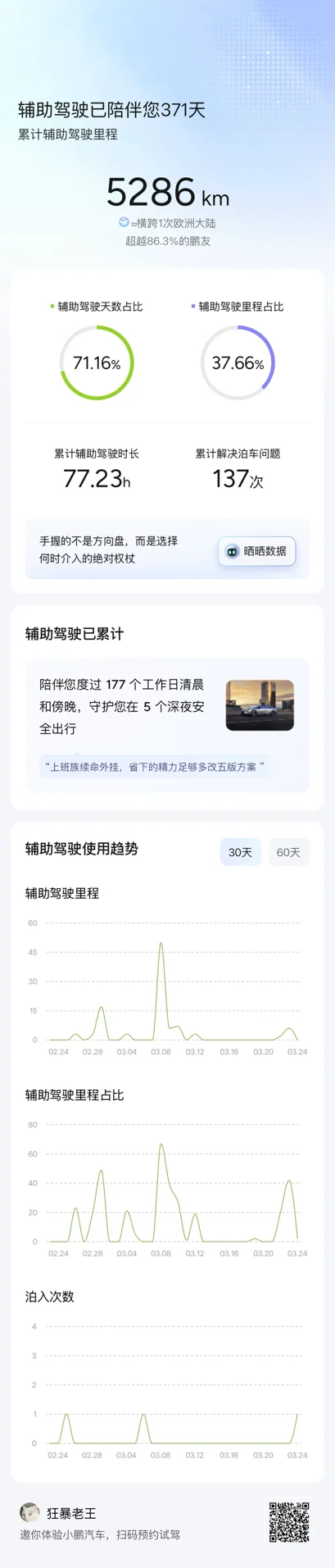 一年来与小p一共走过了1w3千公里,智驾行驶了5286km。只要是不赶时间的情况,已经都让小p来开车了,对ngp的依赖越来越高了,也越来越爱开车出门了。
