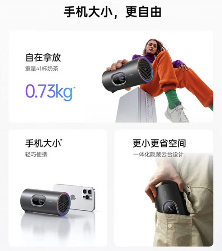 最让我惊艳的是它的便携性。机身仅有0.73公斤,握在手里感觉和一杯奶茶差不多重,官方说的“手机大小”毫不夸张。无论是塞进随身背包,还是单手轻松持握,都毫无负担。它彻底摆脱了传统投影仪的笨重印象,实现了真正的“自在拿放”,为行李节省了大量空间。