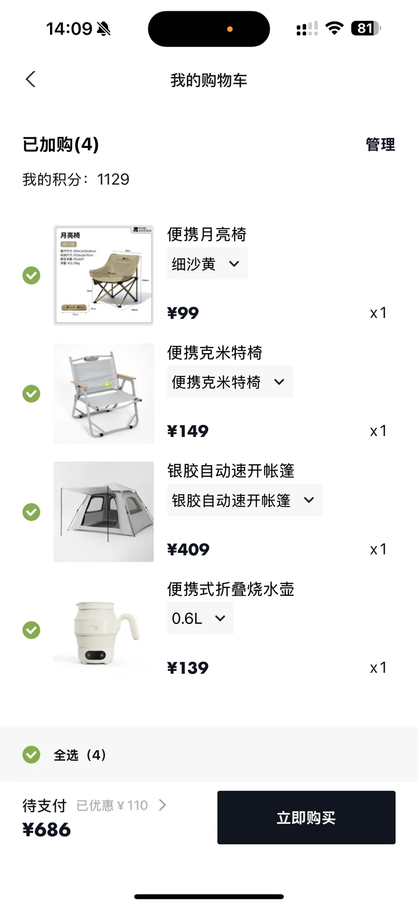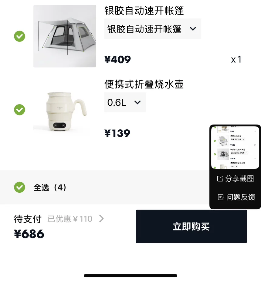 #好物分享# 春天真的适合出去露营🏕️~我购物车这些东西,咱就是说,这套装备一买,露营幸福感直接拉满!那个便携月亮椅,坐上去像陷在云朵里,腰背瞬间放松克米特椅颜值超高,拍照巨出片,露营氛围感拿捏!银胶自动速开帐篷最省心,几秒就支棱起来,不用费劲折腾,懒人福音!还有折叠烧水壶,0.6L大小刚好,煮水泡茶超方便,随时喝热水太贴心~关键是加起来才六百多,性价比绝了!以后周末随时拎包去撒野,躺着看星星、喝茶唠嗑,这才是生活该有的松弛感呀~