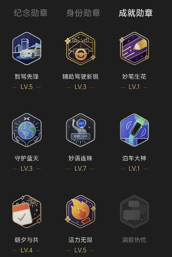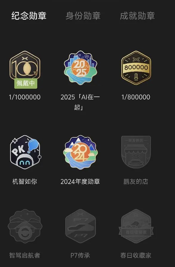 #晒晒我的勋章# 我的第一枚勋章是2024年度勋章,2024年12月26日提小鹏P7+,从此成为鹏友。 智驾先锋LV.5,解锁智能出行的从容;妙语连珠LV.7,在社区分享热爱与温暖。活力无限、朝夕与共、守护蓝天,见证与P7+相伴的日常。 从泊车大神到充电领航,每一枚勋章都是时光的印记。以热爱为序,与小鹏同行,奔赴更多智能出行的精彩!
