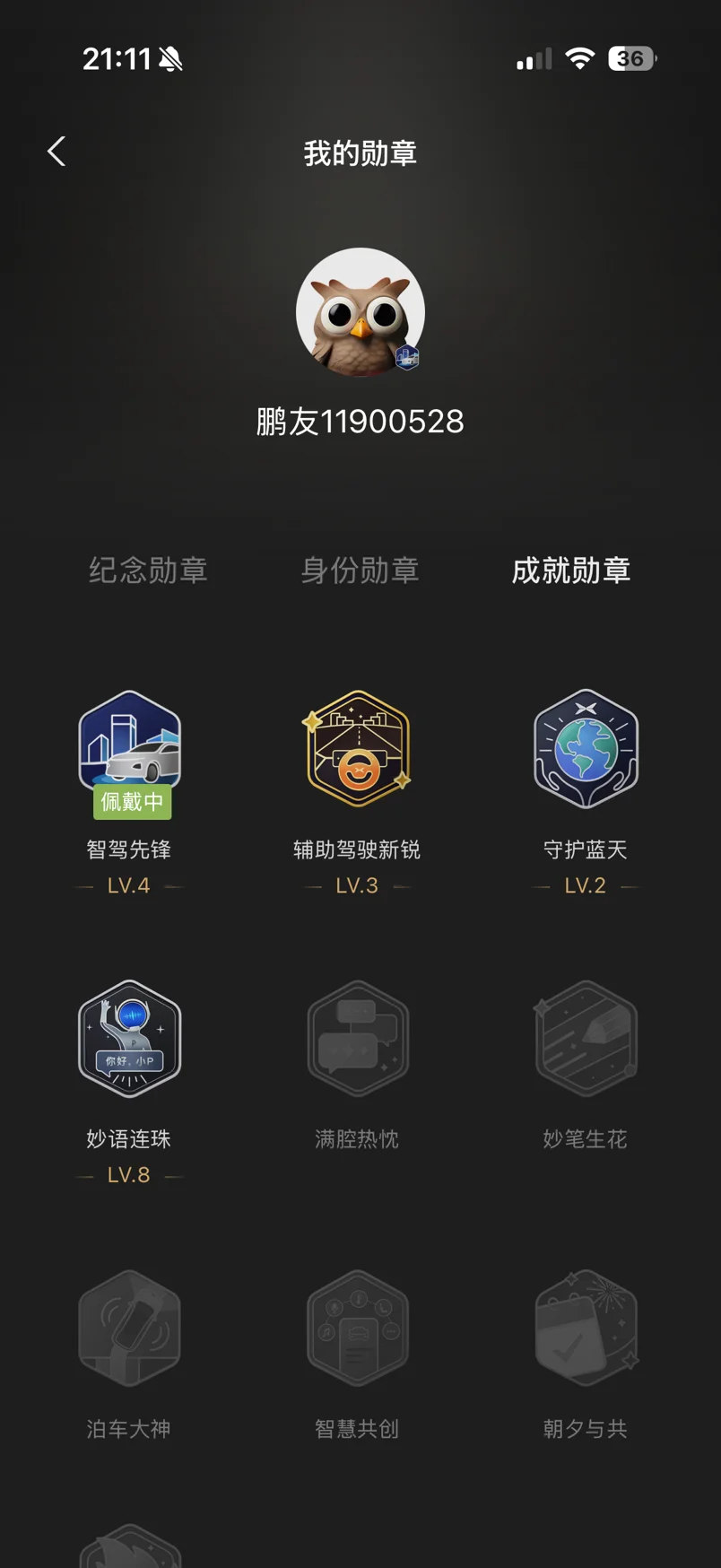 #晒晒我的勋章# G6陪伴我半年以来,已经获得8枚勋章啦,智驾先锋,辅助驾驶新瑞,守护蓝天,妙语连珠这些勋章最受我青睐。当前我佩戴的智驾先锋,因为我平时出行喜欢用小鹏的智驾,希望小鹏未来可以推出很,更多新颖的勋章给车主。