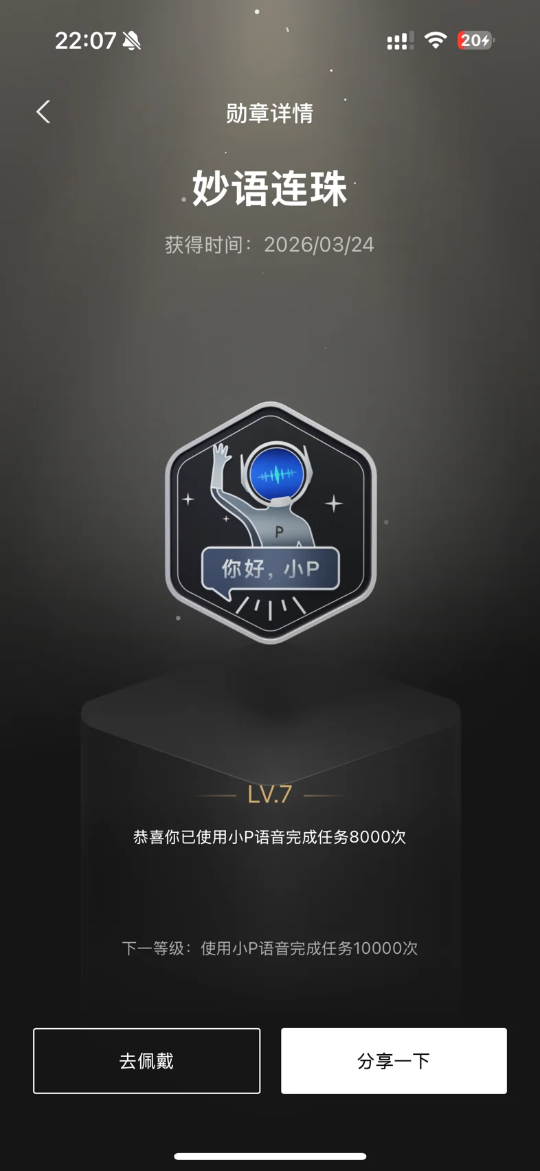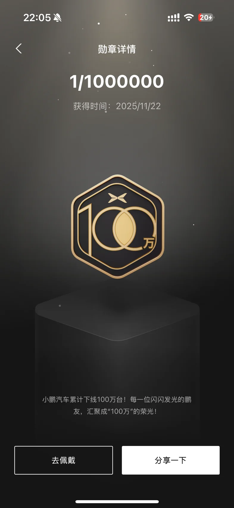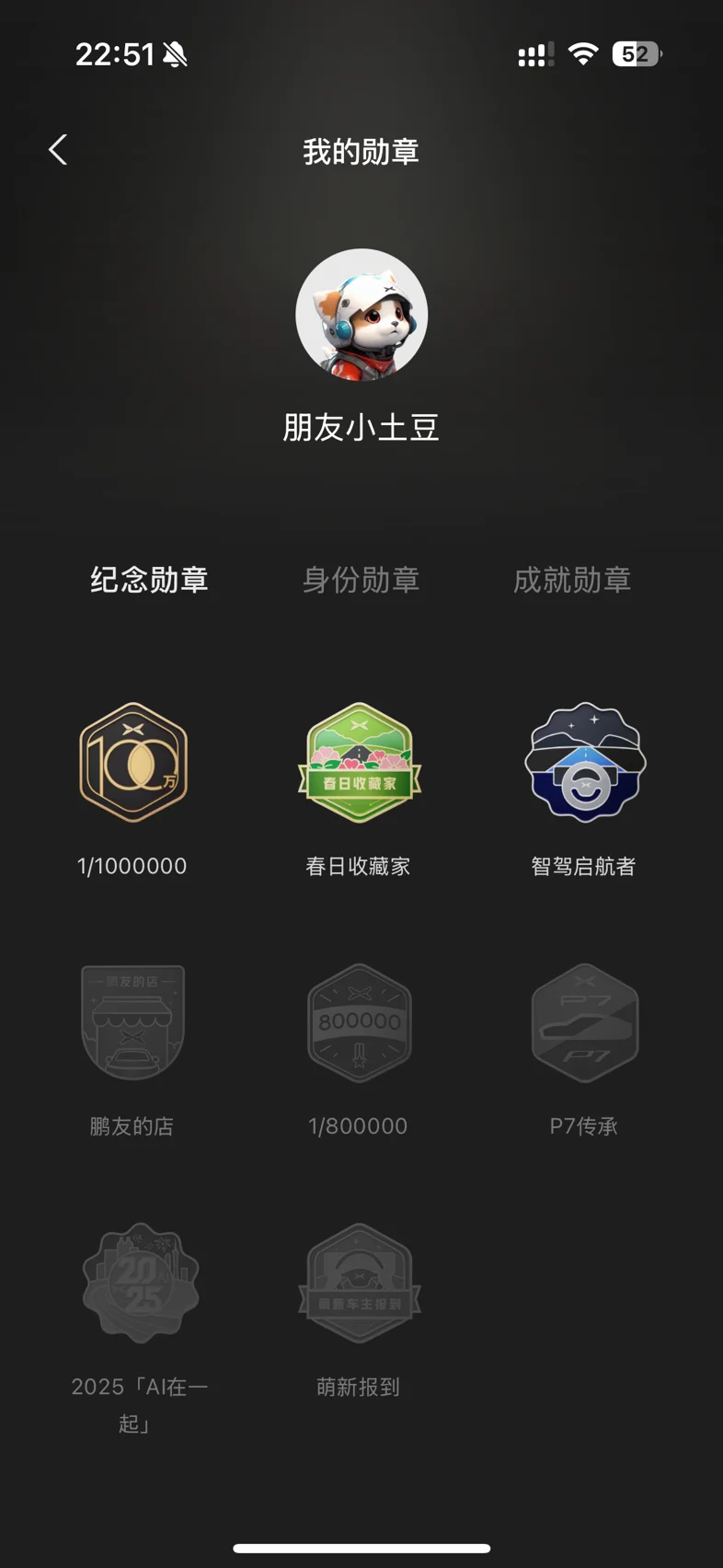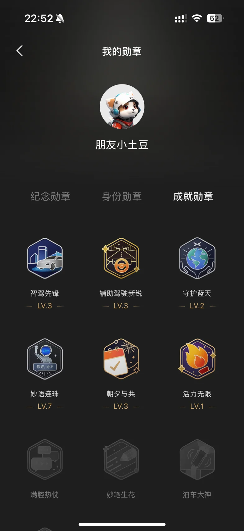 #晒晒我的勋章# 买了mona3半年不到,已经积累了11个勋章啦~比较有意义的有以下几个:妙语连珠:你好小p真是太好用了,超级智能大管家。每天都要呼唤好多次,秉持能动手不动口的态度。守护蓝天:短短四个多月,已经开了10000公里啦~智架先锋:ngp确实很方便,上下班通勤,高速,堵车,都喜欢ngp~1/1000000:小鹏下线100w台,自己也是一份子,希望小鹏越来越好