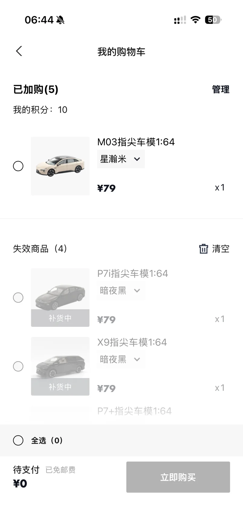 目前购物车里就是各个车模,哈哈哈哈。想着把小鹏的都搞一个的。