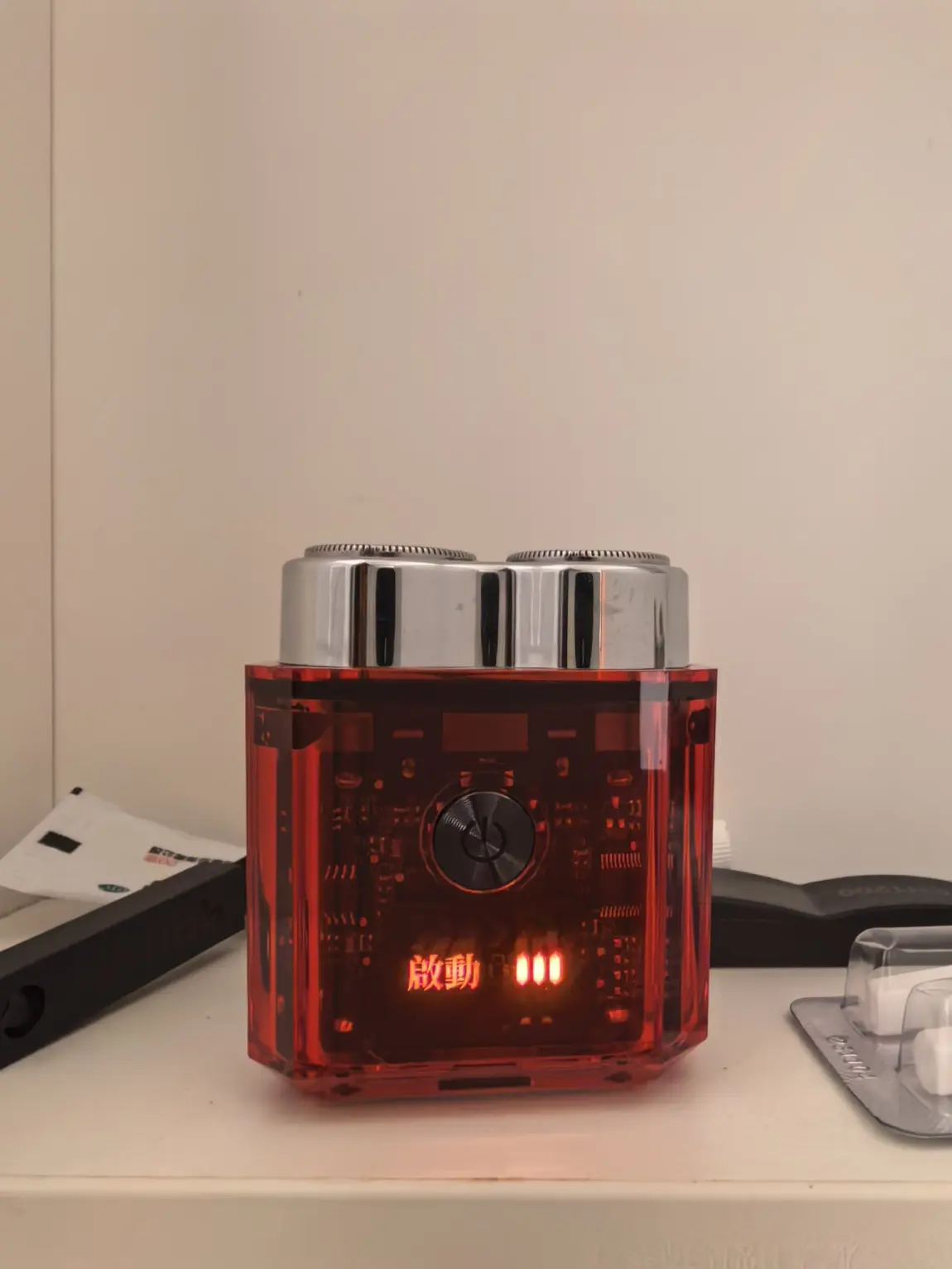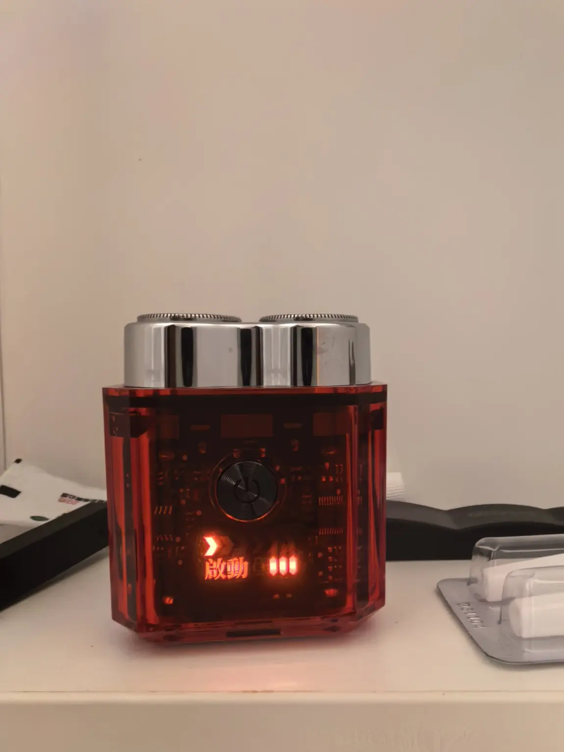 打开盒子,主角ICE小冰砖剃须刀就躺在里面。透明红的机身太戳我了!可以直接看到内部的电路板和精密结构,赛博朋克感拉满,放在梳妆台上就是一件高颜值摆件,每次看到都忍不住多摸两下。