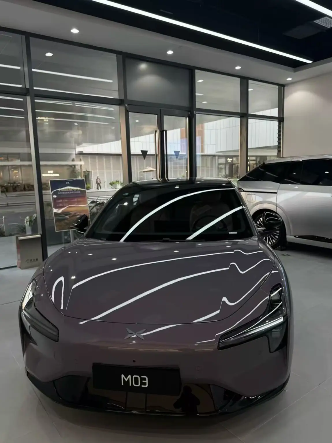 刚进店就被这台星暮紫的小鹏M03牢牢抓住眼球!低趴的轿跑姿态搭配流畅的溜背线条,完全是年轻人喜欢的运动感。前脸设计极具辨识度,分体式大灯组犀利灵动,贯穿式的日行灯点亮后科技感拉满,中间的小鹏X标精致醒目,搭配下方黑色运动包围,气场直接拉满。