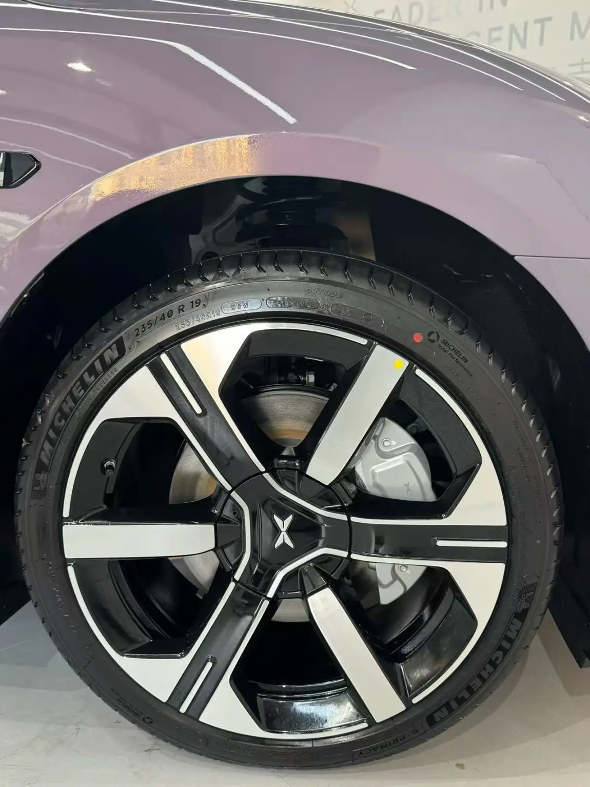 走近看细节,19英寸的双色运动轮毂造型动感十足,黑银撞色的五辐设计,和整车的运动风格完美契合,中间的小鹏标也呼应了品牌设计。轮胎选用了米其林浩悦系列,规格为235/40 R19,这套轮胎主打静音舒适与抓地力,既能保证日常通勤的静谧性,也能在激烈驾驶时提供足够的支撑,兼顾了家用与操控需求,同价位里这个配置诚意拉满。