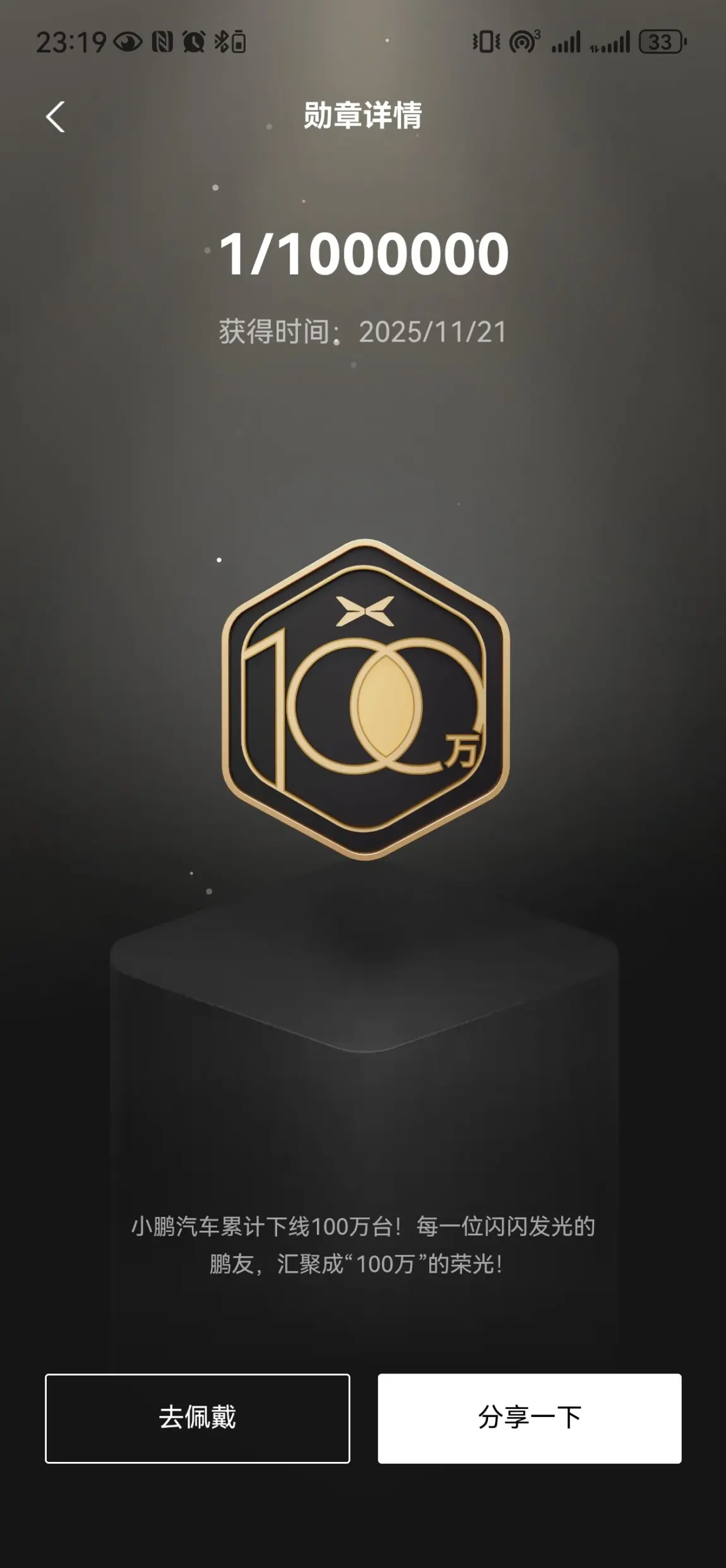 拿到这枚「1/1000000」勋章,是与小鹏共赴百万征程的见证。从第一台到第一百万台,我们都是荣光里的微光,未来继续与智能出行同行。