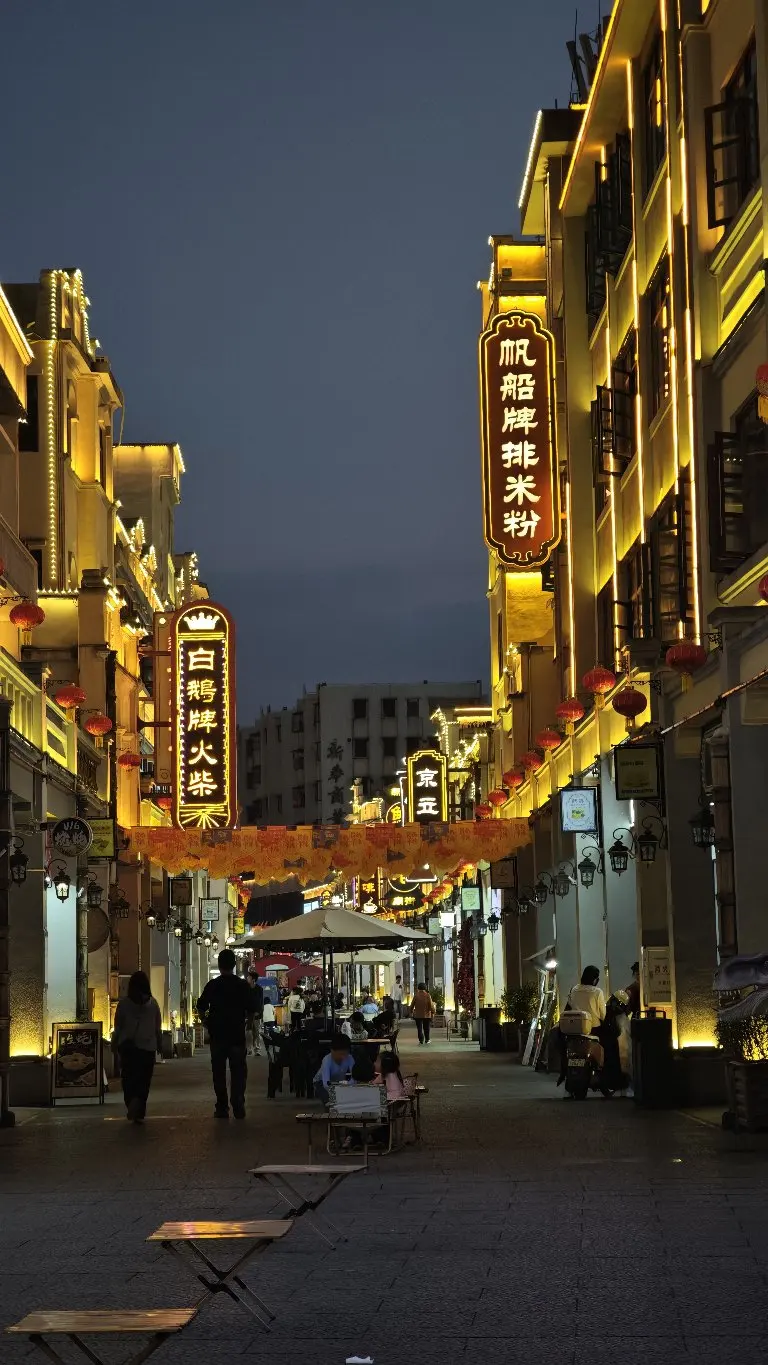 暮色渐沉时,老街的烟火气慢慢晕染开来。骑楼的暖黄灯光次第亮起,勾勒出复古的檐角与窗棂,青石板路上映着细碎光影,连晚风都裹着淡淡的市井香气。提着相机漫步其间,既能捕捉到“我在庙街很想你”的浪漫打卡点,也能撞见骑楼廊下闲聊的街坊、挑拣食材的摊主,每一处都藏着鲜活的生活气息。夜幕完全降临时,古桥与河畔的灯串连成星河,倒映在波光里,让老街多了几分温柔的诗意。