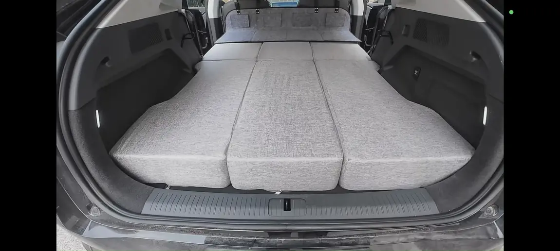 我把提前准备好的充气床垫铺在平整的车厢里,轻轻按压让它慢慢鼓起来,贴合着车内的每一寸空间。再铺上带着春日图案的床品,摆上柔软的抱枕,原本冰冷的车厢瞬间变成了温暖的小窝。打开车顶的阅读灯,暖黄的光线漫过床面,连窗外的鸟鸣都变得温柔起来,仿佛在提醒我:这场春日露营,已经正式开场了。