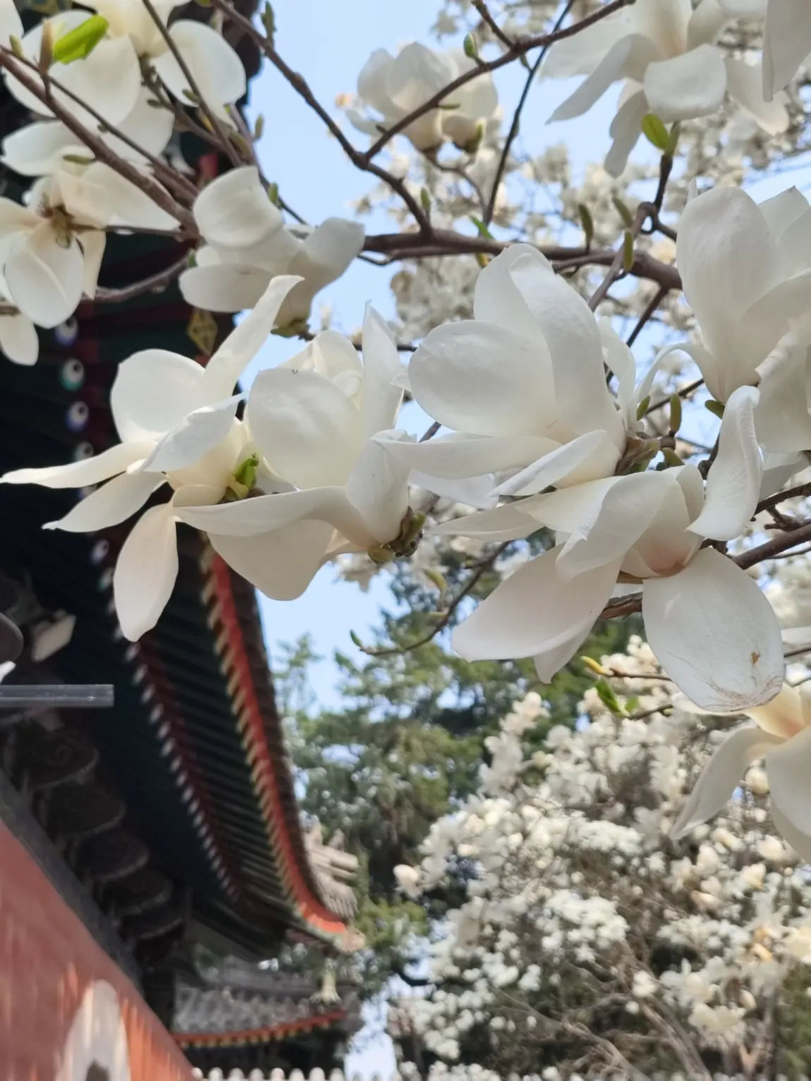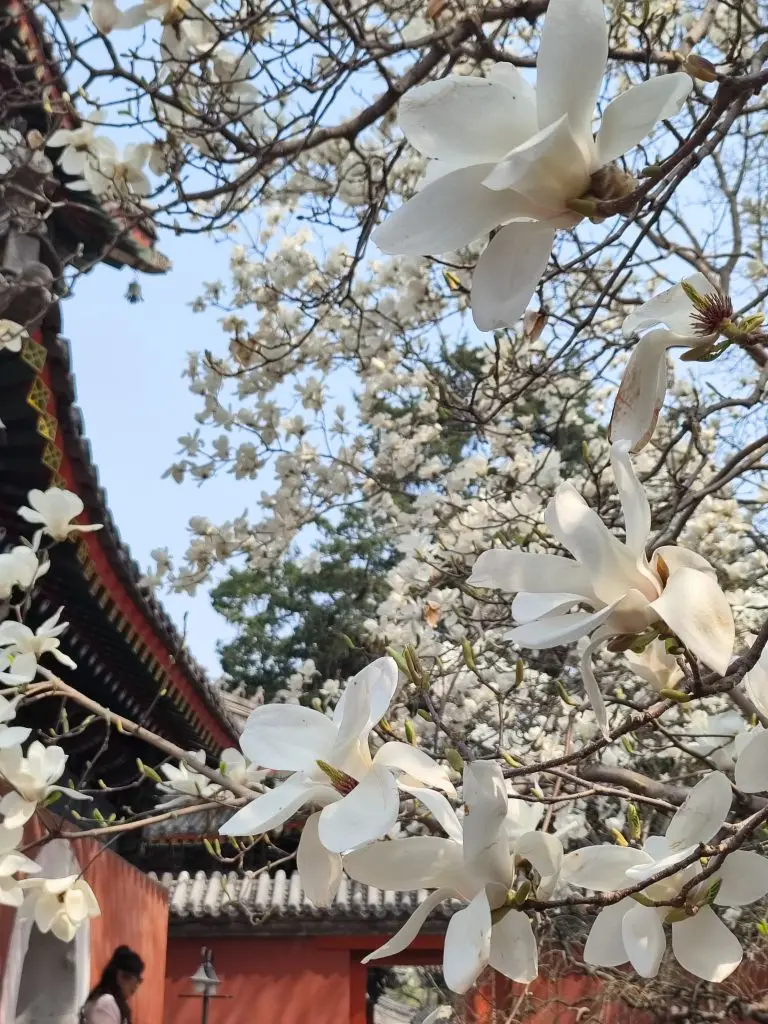 进去以后就能看到满眼的玉兰花,一堆人围着拍照。这的玉兰花花朵很大,很漂亮。说是故宫、颐和园、太庙、万寿寺等地的玉兰花都是大花朵,之前去过北京国际雕塑公园,里面玉兰花是真多,但大多都是小花朵,少了一点大花朵的大方庄重。