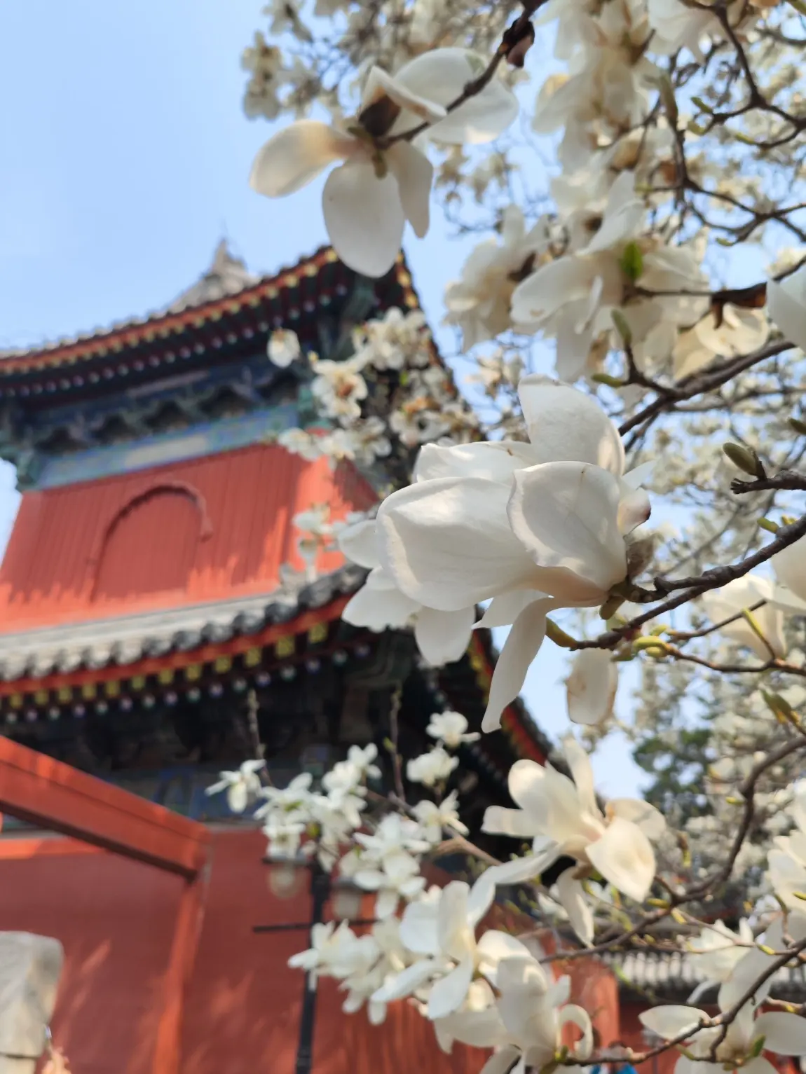 红墙白花经典搭配,寺内还有艺术展,赏花看展,好不惬意~