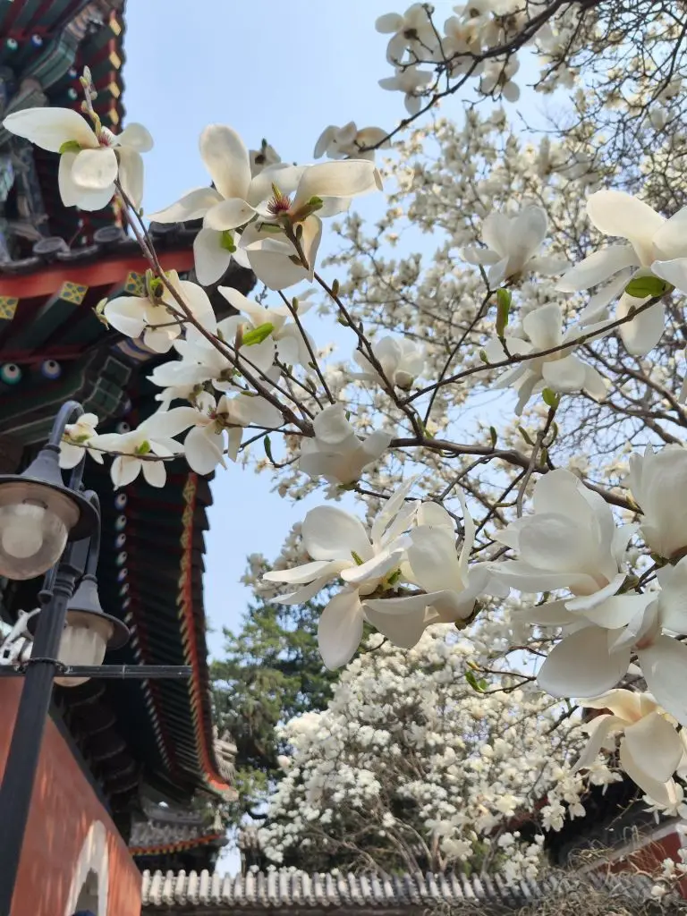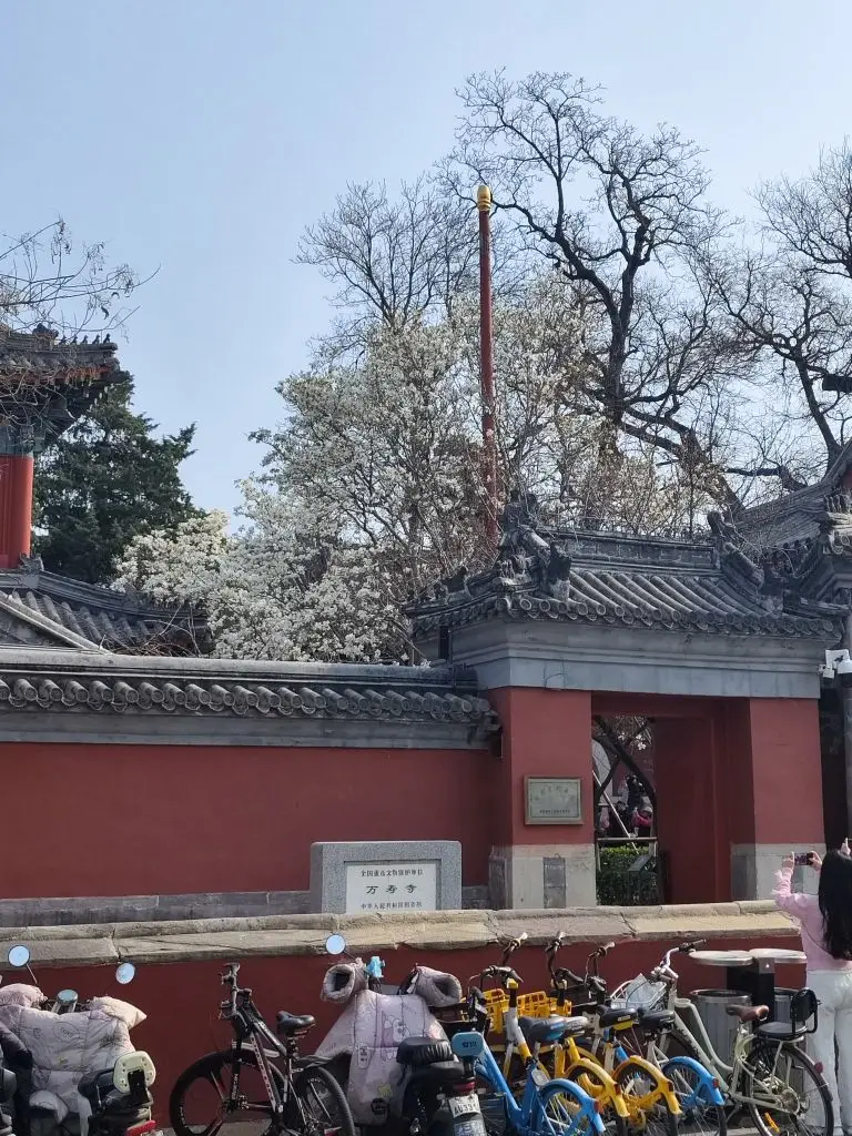 只能在公众号预约买票,前一晚搞定,第二天一早导航到广源大厦地下停车场,再走个400米就到万寿寺南门了,刚到南门就看到了里面的玉兰花,激动了一下。