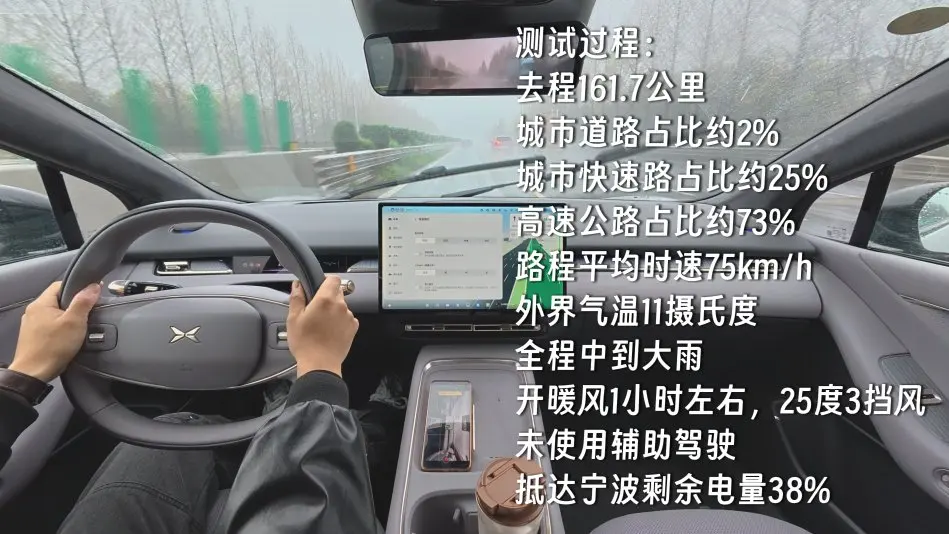 去程161.7公里,城市道路占比约2%,城市快速路占比约25%,高速公路占比约73%,路程平均时速75km/h。外界气温11摄氏度,全程中到大雨,开暖风1小时左右,25度3挡风,未使用辅助驾驶,抵达宁波剩余电量38%。
