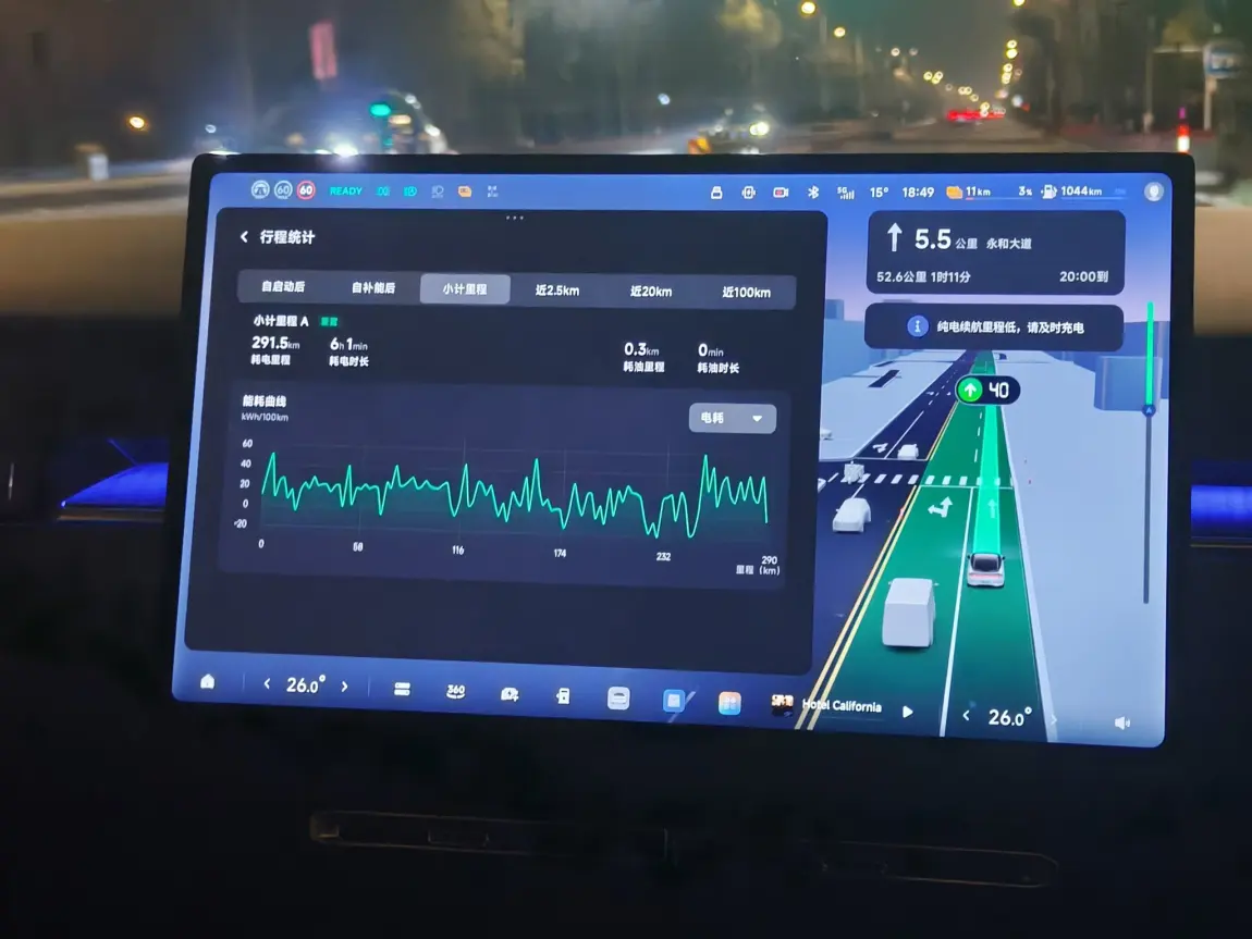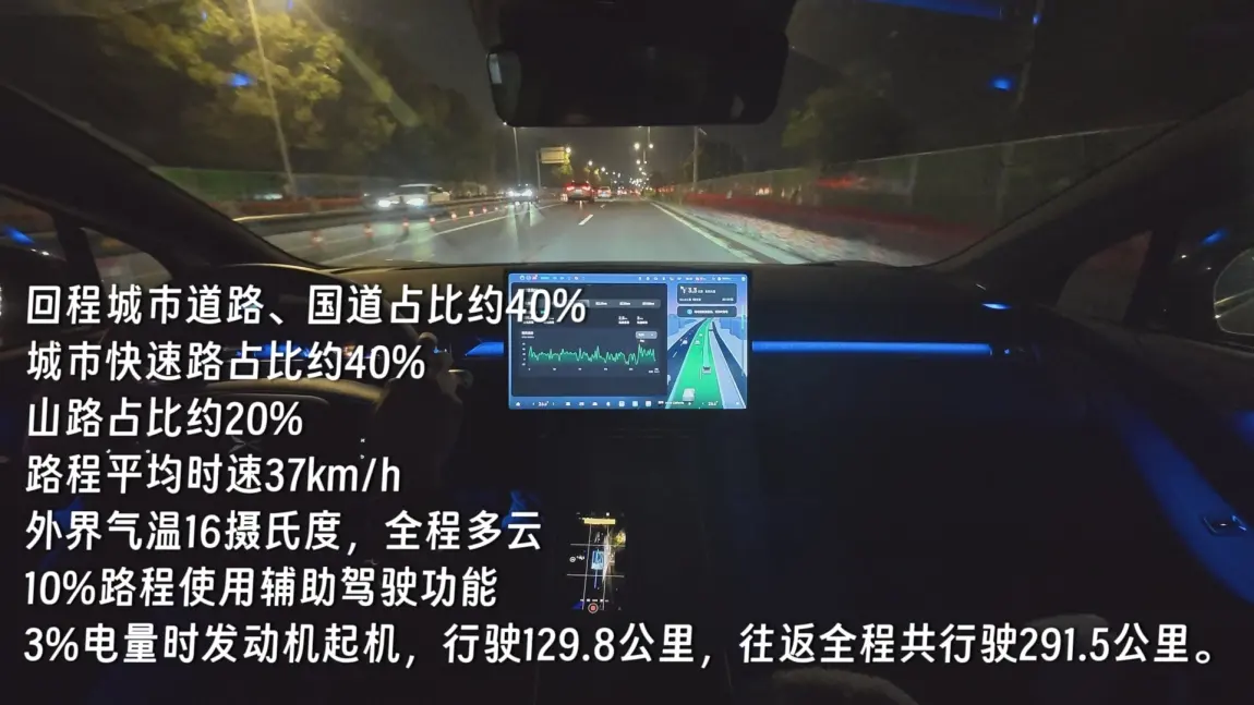 回程城市道路、国道占比约40%,城市快速路占比约40%,山路占比约20%,路程平均时速37km/h。外界气温16摄氏度,全程多云,10%路程使用辅助驾驶功能,3%电量时发动机起机,行驶129.8公里,往返全程共行驶291.5公里。
