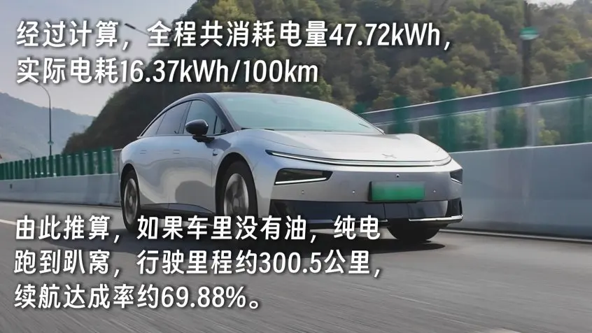 经过计算,全程共消耗电量47.72kWh,实际电耗16.37kWh/100km。由此推算,如果车里没有油,纯电跑到趴窝,行驶里程约300.5公里,续航达成率约69.88%。
