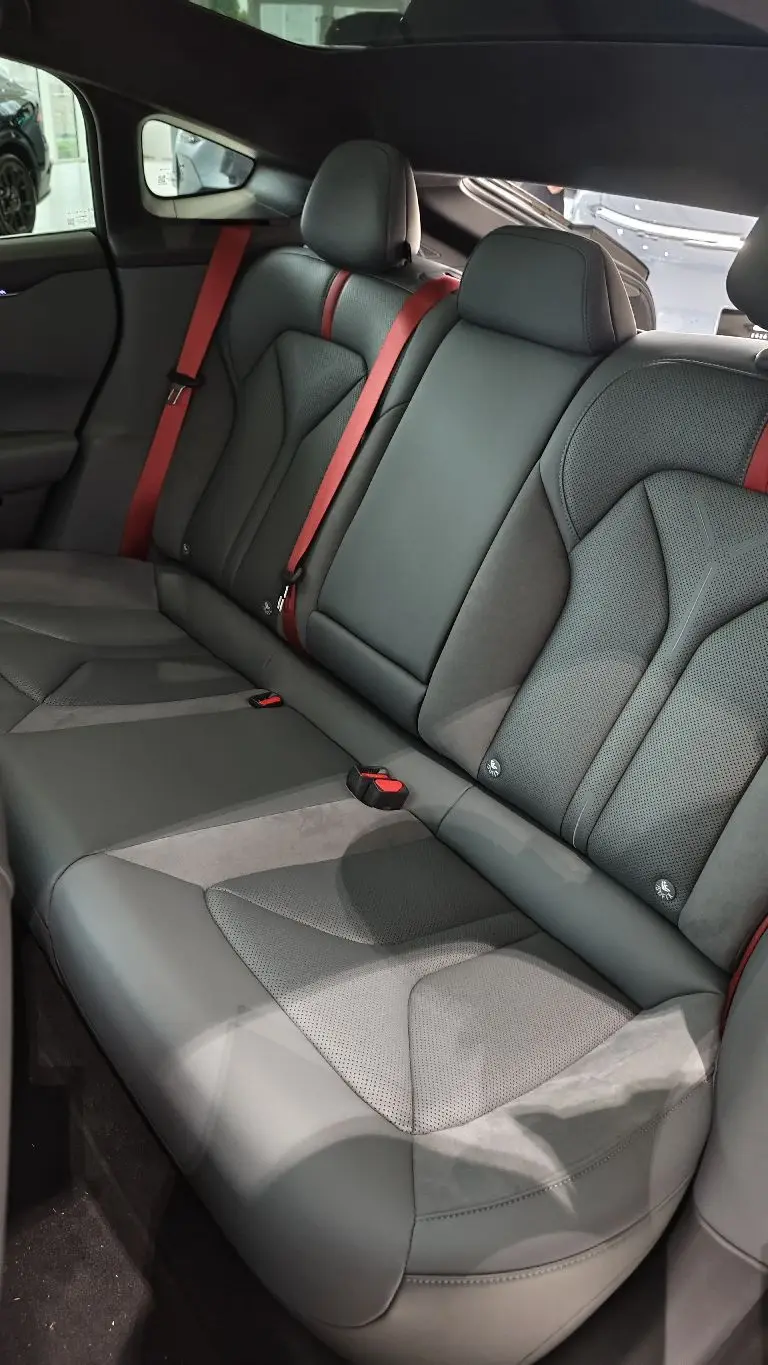 新轮毂的确好看,有点机械的感觉,让整体表现更加硬朗。拉开车门,烈焰红安全带破暗而出!黑色麂皮内饰冷静克制,而横贯胸前的红带如热血脉络,瞬间点燃驾驶欲望。