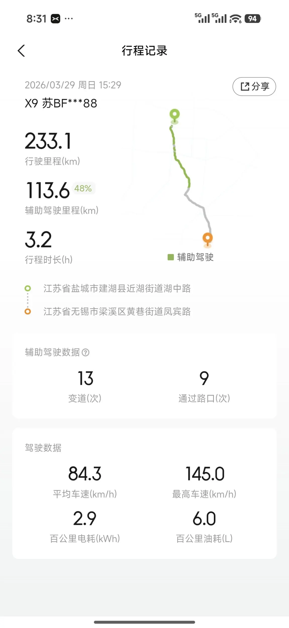 刚提的X9增超级程 无锡~盐城,早晨7:30出发,晚上18:30回到无锡,满坐6大1小,95%高速,满电出发,亏电回程,纯电续航270KM,亏电油耗6升,这个成绩怎么样?