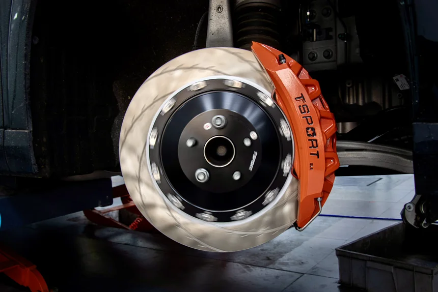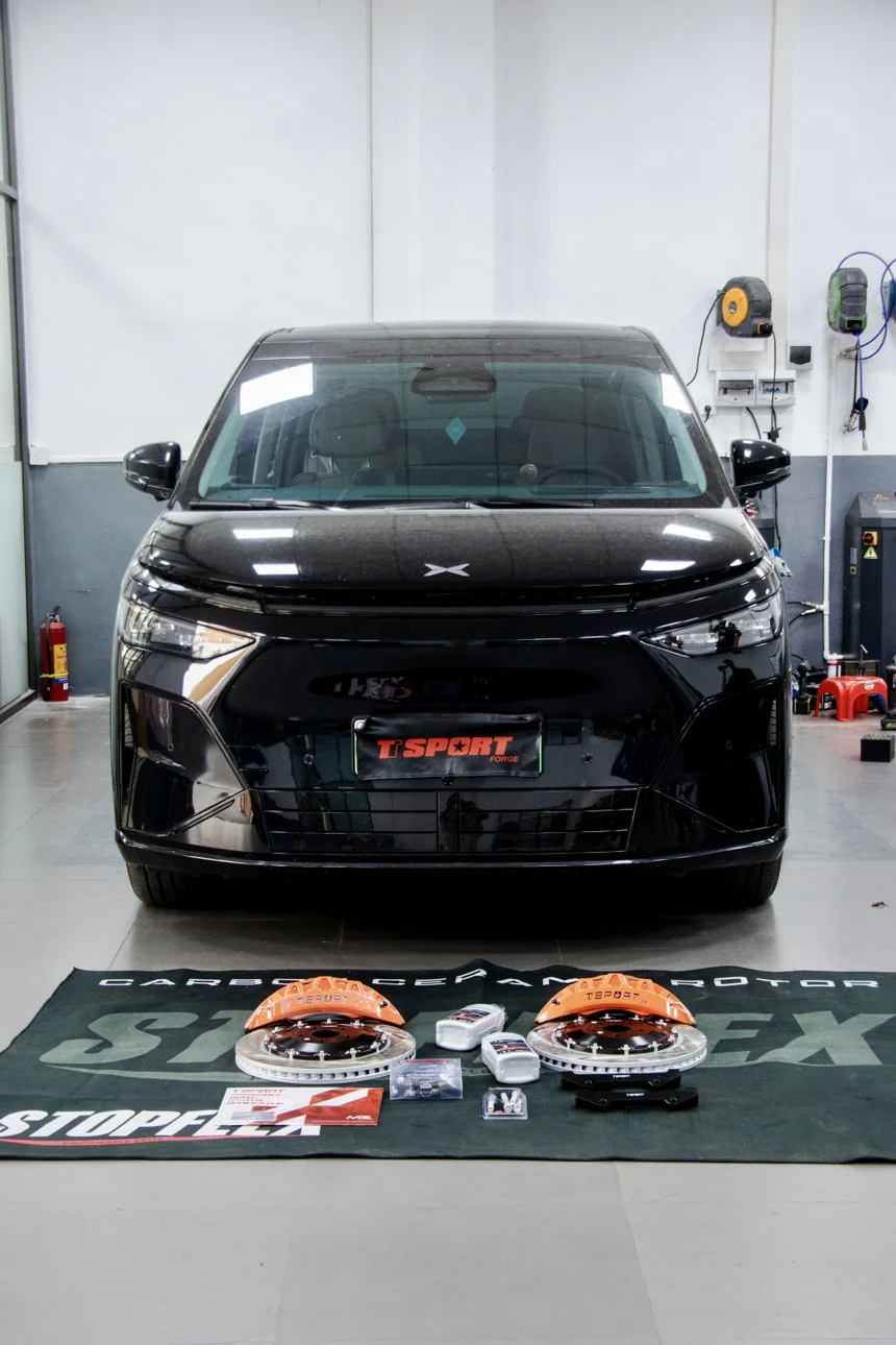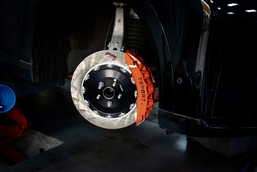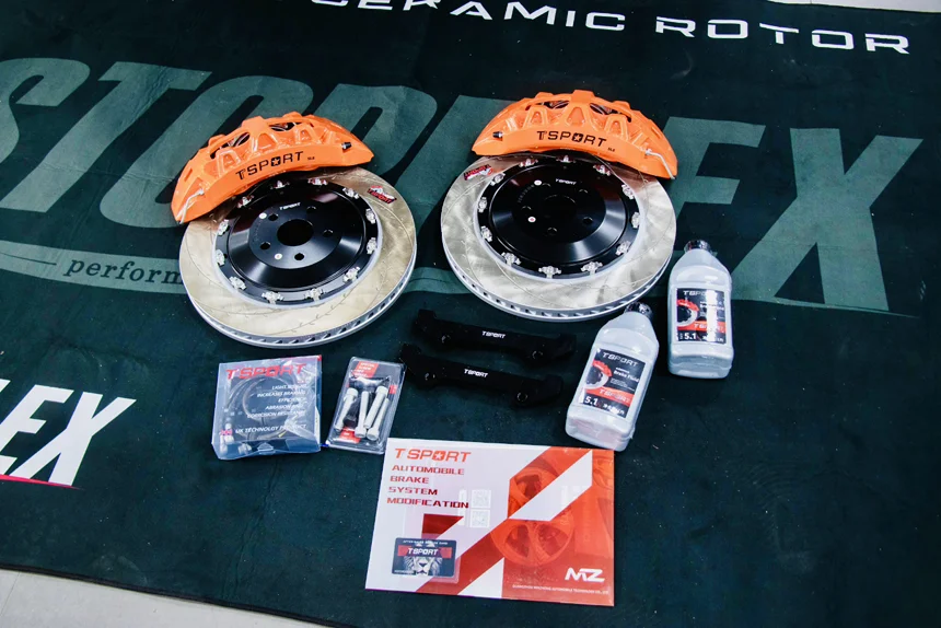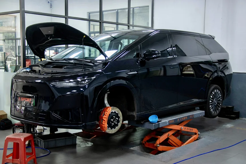 升级刹车卡钳,并不是黑原厂卡钳不好!车身比较重,有时候急刹拉不住。更加稳妥的方式升级下8活塞卡钳,比较线行!超薄不用加法兰,原厂20寸轮毂可以安装,很多进口卡钳需要换轮毂或者加法兰!