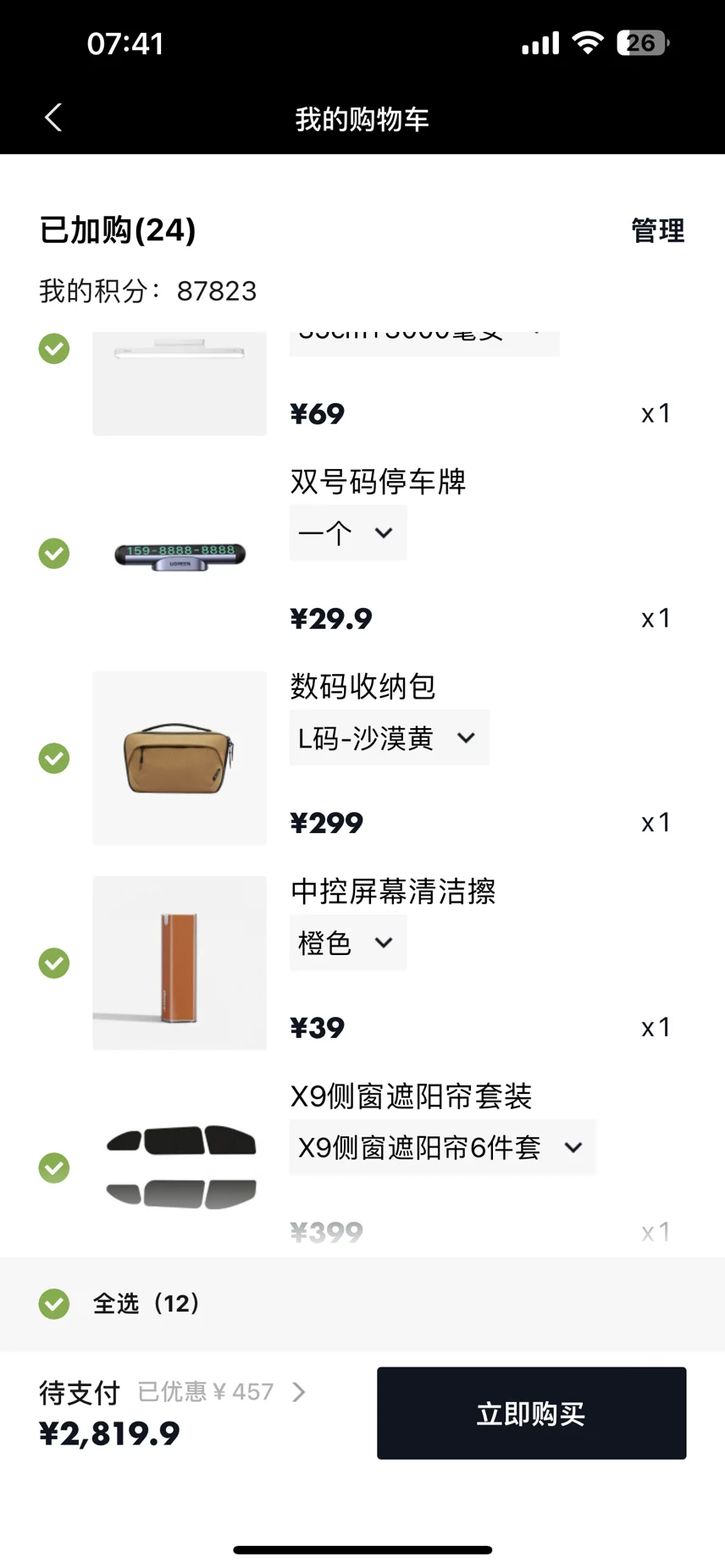 购物车已经攒了24件宝贝,每一件都是精挑细选的刚需:X9侧窗遮阳帘套装、数码收纳包、中控屏幕清洁擦、双号码停车牌,还有屏幕挂灯、车载香薰……每一件都想立刻抱回家!