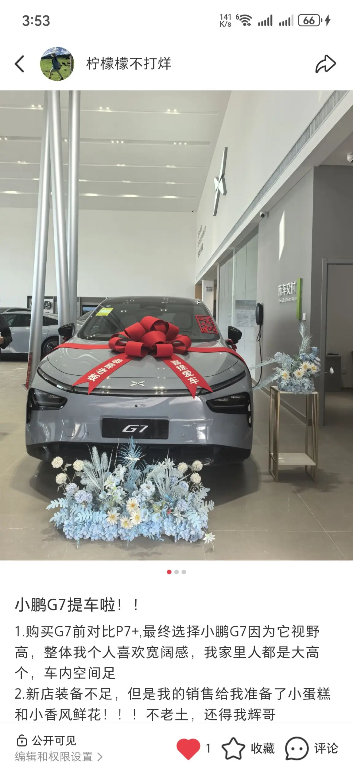 #我的提车作业# 我的大玩具来了,小鹏G7提车啦!!1.购买G7前对比P7+,最终选择小鹏G7因为它视野高,整体我个人喜欢宽阔感,我家里人都是大高个,车内空间足2.新店装备不足,但是我的销售给我准备了小蛋糕和小香风鲜花!!!不老土,还得我辉哥3.目前驾驶我的小车车跟我遭了不少罪各种蹭!!!但它的智驾感,驾驶舒适度很nice!!!(高速打盹:错误示范)它开车!!!因为我包夜真的很困!!他会警告提醒我~#换车的尽头是电车 另外油价上涨我二十天左右充一次电!!!一次六十,一个月最多120的消费!!
