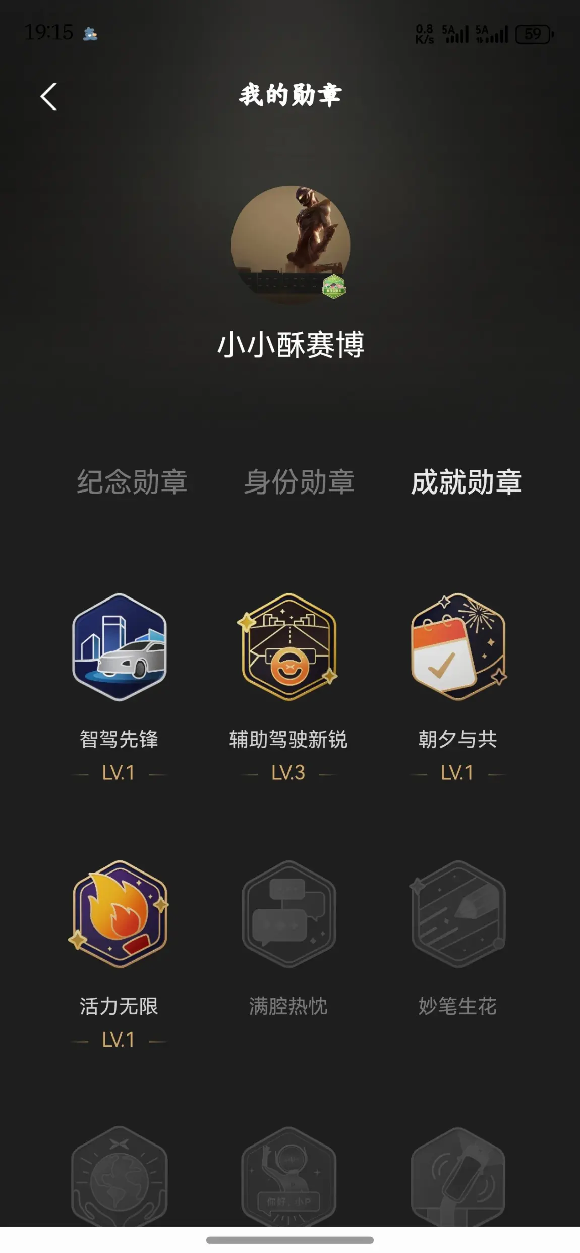 我的第一个勋章是智驾启航者,当时刚提上新车就使用了智驾,智驾很稳,很棒,确实大大解放了双手,在这一个月时间获得的勋章很多,有了8个,慢慢积累吧。