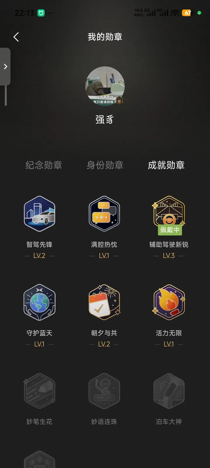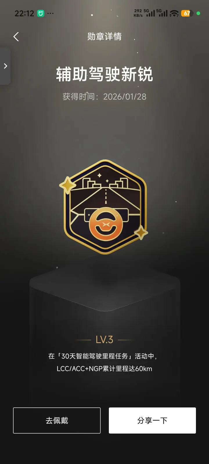 #晒晒我的勋章# 不知不觉就12枚勋章啦,我印象最深最喜欢的勋章就是这枚“辅助驾驶新锐”了,我清晰地记着获得它的过程,是我驱车快三百公里从广州将车开回家,第一次使用辅助驾驶功能,从开始的心惊胆战到后来的游刃有余,这枚勋章是时光的见证者。