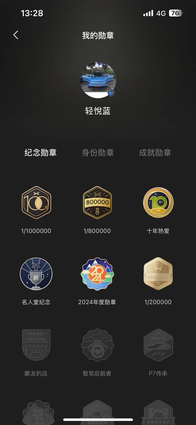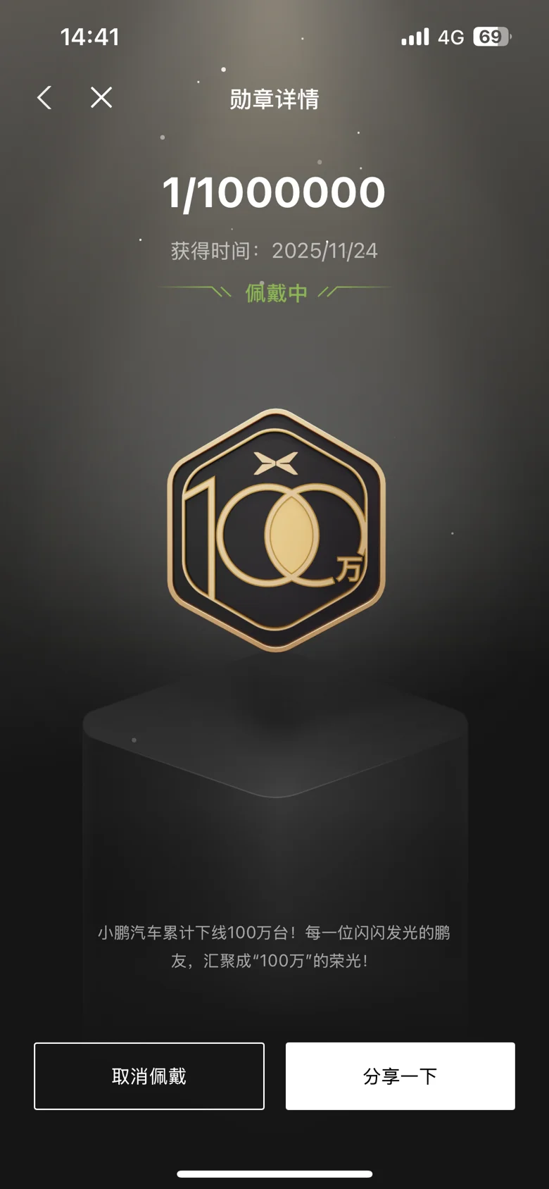 刚才留意到鹏厂的勋章已经拿到18个了,最值得还是庆祝鹏厂100万辆的纪念勋章🎖️希望有机会拿到鹏厂200万分之一的纪念勋章🏅