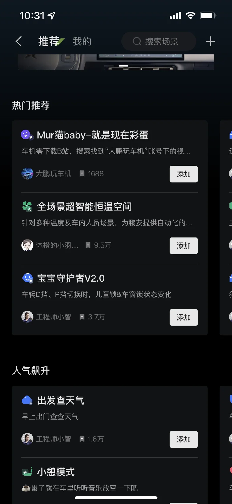 如何添加:在App首页点击“小鹏”→“智慧场景”,可以搜索“场景码”一键添加,也可以自己动手创建。