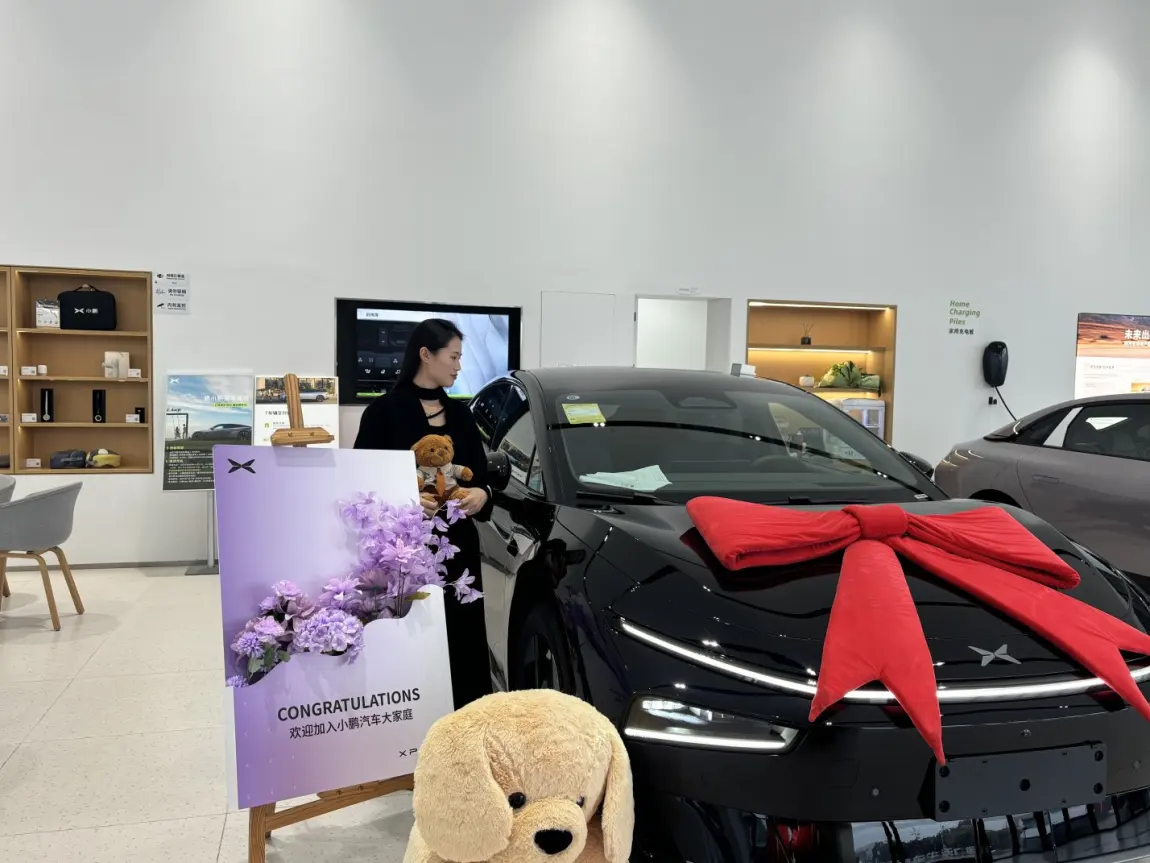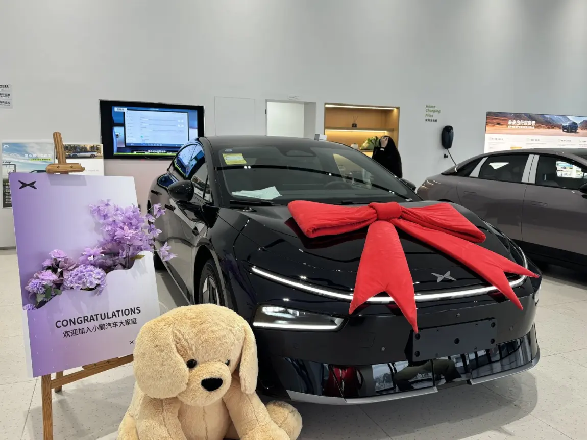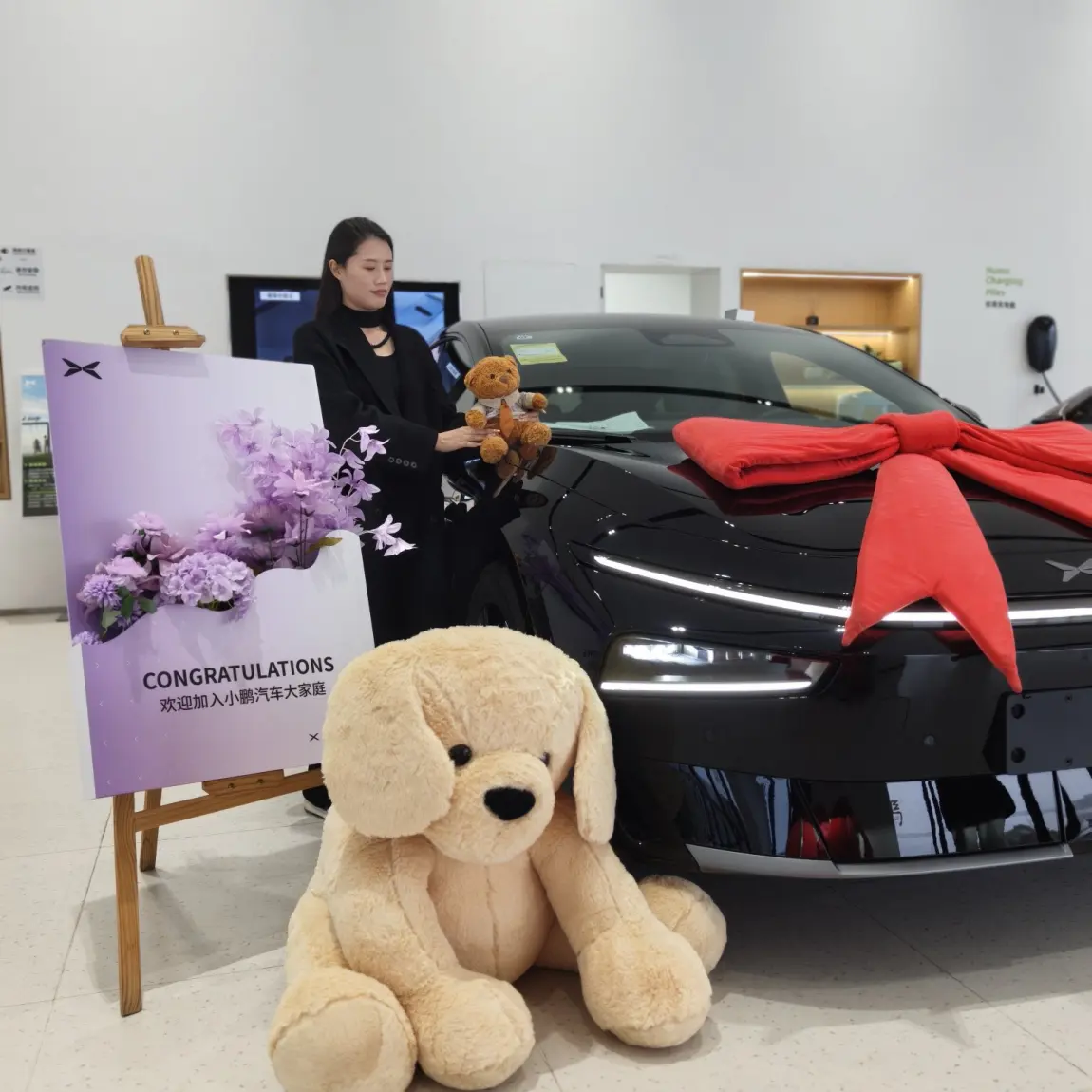 🚗✨终于提车啦!黑色车身搭配大红蝴蝶结,仪式感满满❤️。展厅布置温馨,工作人员贴心周到😊。旁边的大熊玩偶也太可爱了吧🧸!整个过程顺畅又愉快,细节处处体现用心🌟。爱了爱了,小鹏友真的值得拥有🥰!