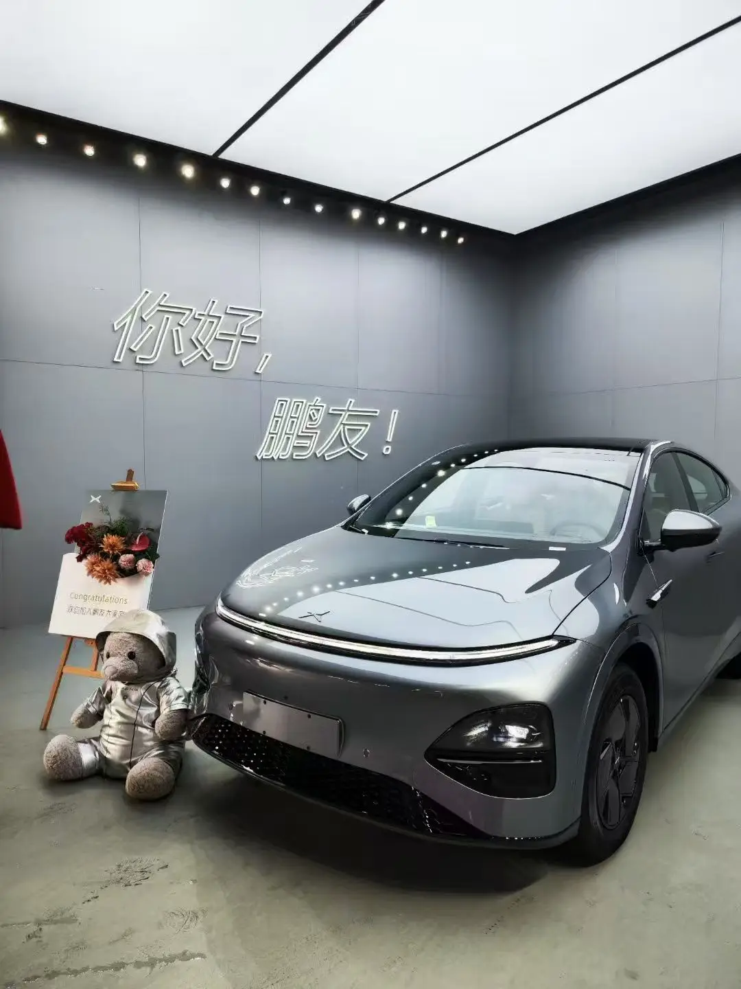 付尾款、办保险、打临牌,整个过程两个小时搞定。最后,交付中心准备了鲜花和小鹏熊,在我的“灰武士”前拍了交车照,仪式感满满。