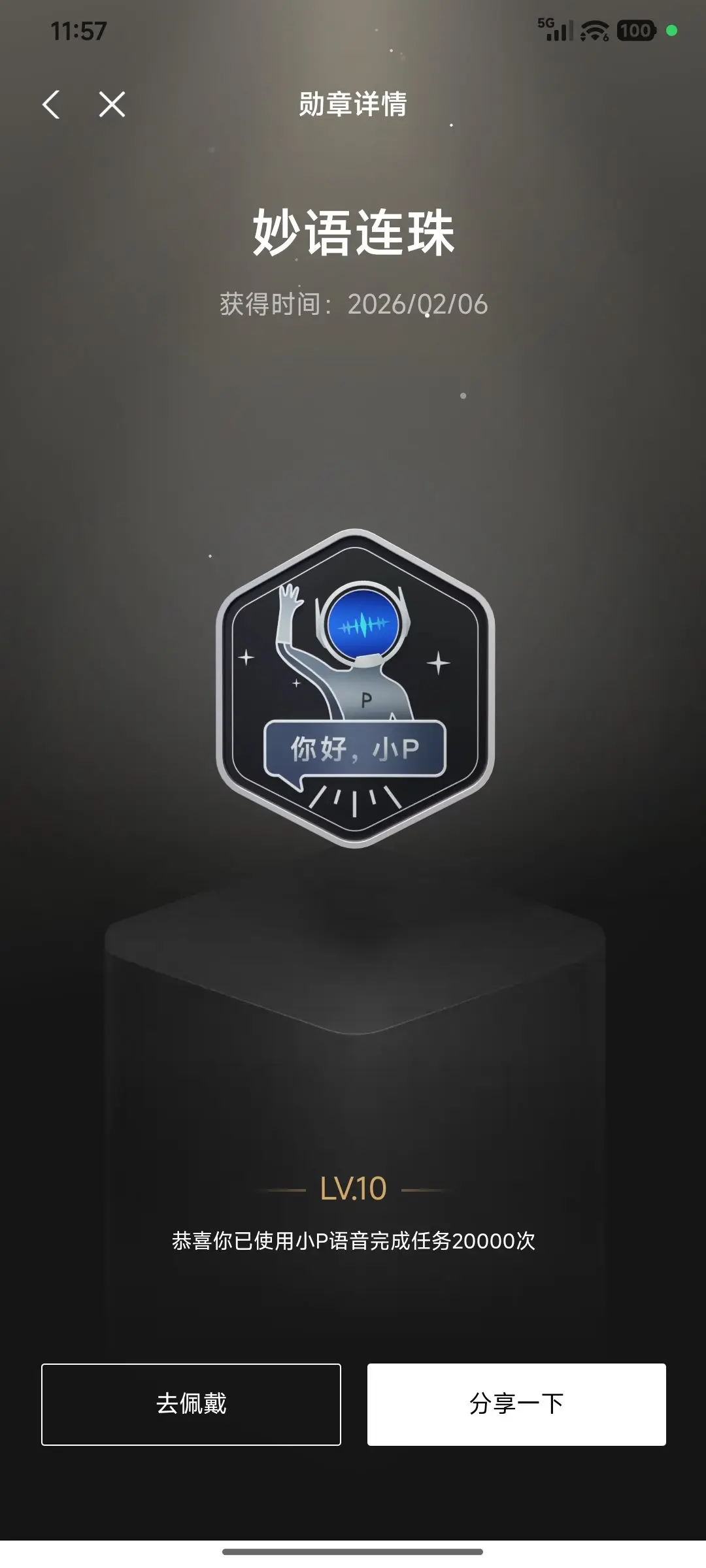顾名思义,它代表的是我已经使用小P语音完成任务20000次!作为全家人都爱的智能体小P,带给我们智能汽车的全新体验!因此,我们也荣获了2025年度用车报告的AI语音大师!使用智能汽车,我们绝对是能动口的绝对不动手!