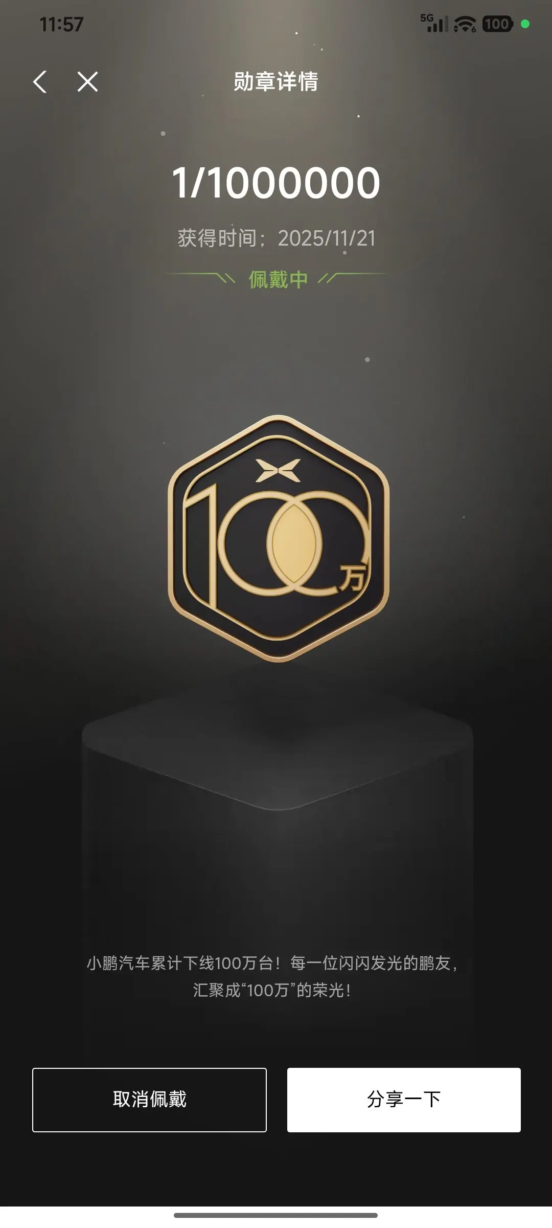 目前我选择佩戴的勋章是"1/1000000",代表着我就是小鹏汽车百万分母中坚实的一份子!期待未来能解锁更多勋章,和小P一起把出行生活过得更精彩~
