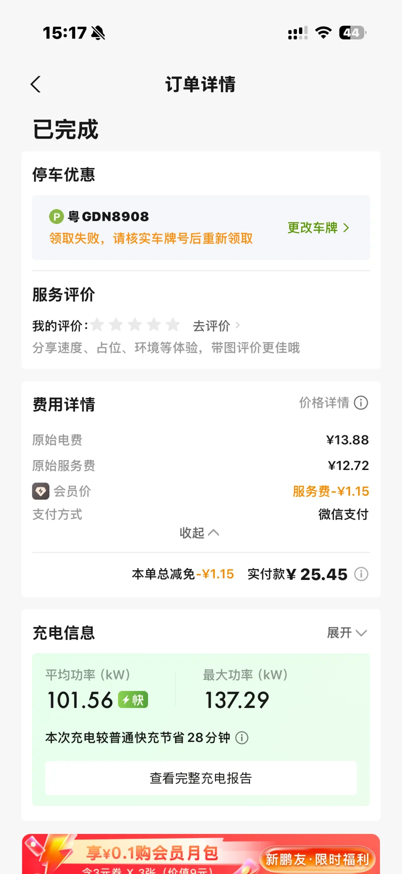 原始电费13.88元+服务费12.72元,会员价减了1.15元,实付才25.45元!