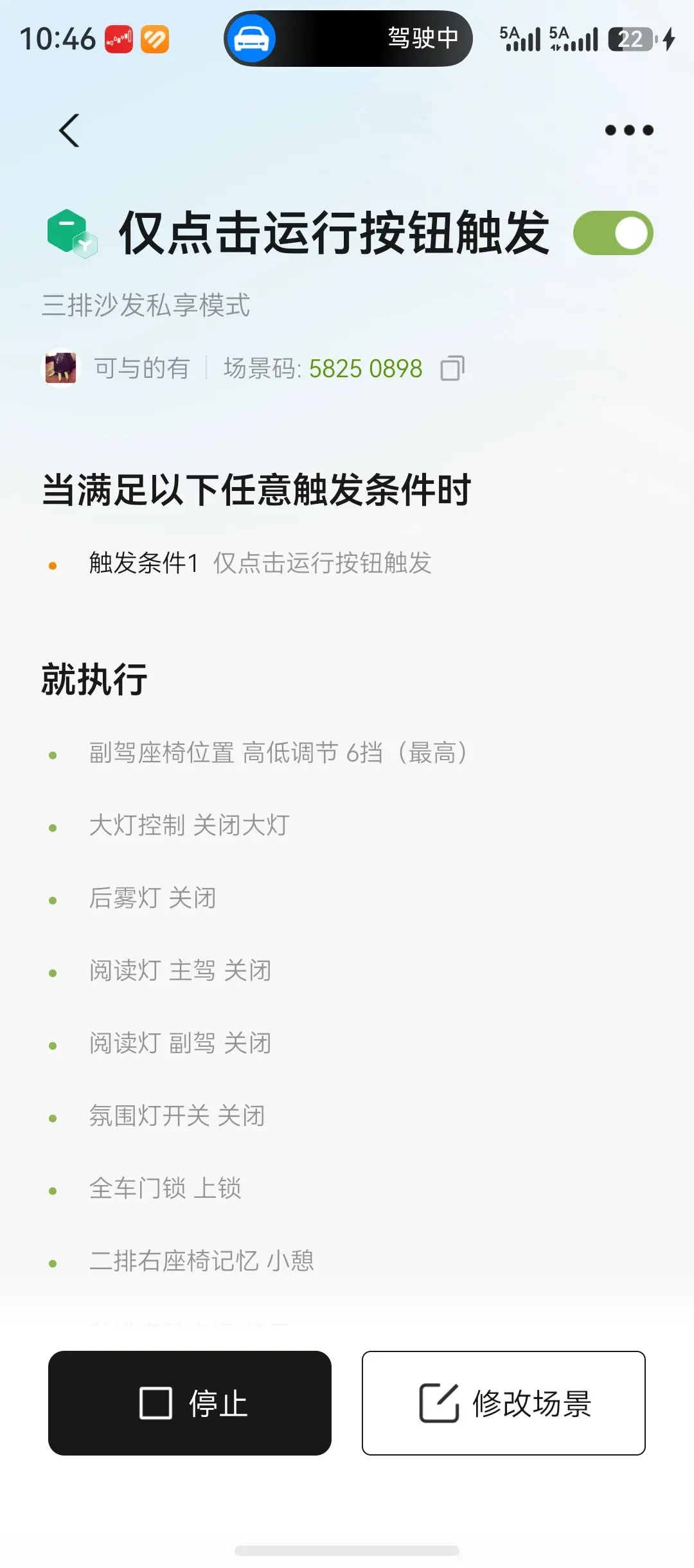 上瘾了上瘾了每天晚上都要把二排放平车里躺一会儿哈哈哈#玩转智慧场景# 最近直接为了这个模式自己编辑了一波智慧场景以后就不用费劲儿一顿喊小P了场景码5825 0898有需要的自取哈特意把前排座椅设置到座椅高度最高增强隐私性