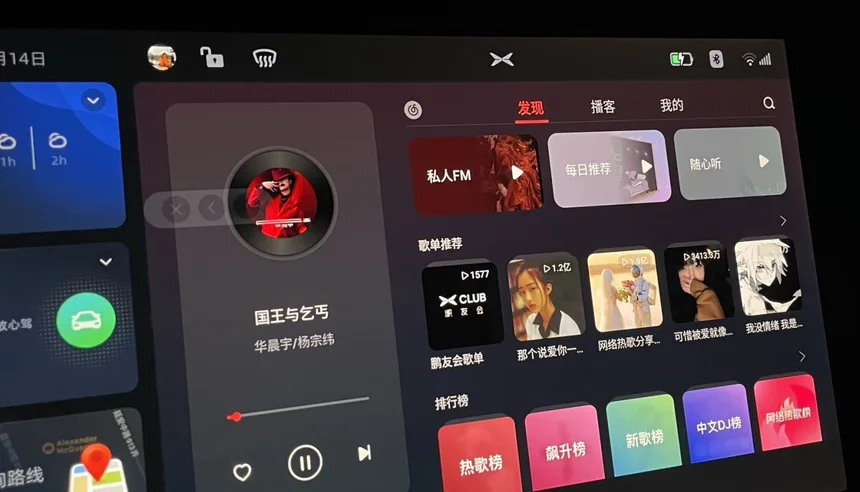 网易云在小鹏大屏上布局合理,字体大、操作顺手。