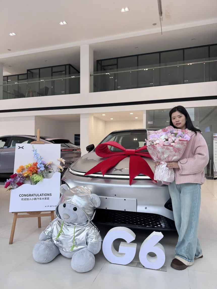 #我的提车作业# 🎀来提我的小灰灰G6啦~等待终于迎来好消息!赶在节前顺利提车,从下定到交付这一路,虽然有点小漫长,但看到实车的那一刻,所有等待都值了!📸新车系上大红花,仪式感直接拉满,还有鹏厂限定的可爱小熊相伴,幸福感爆棚!✨#萌新报到-我的提车作业 #