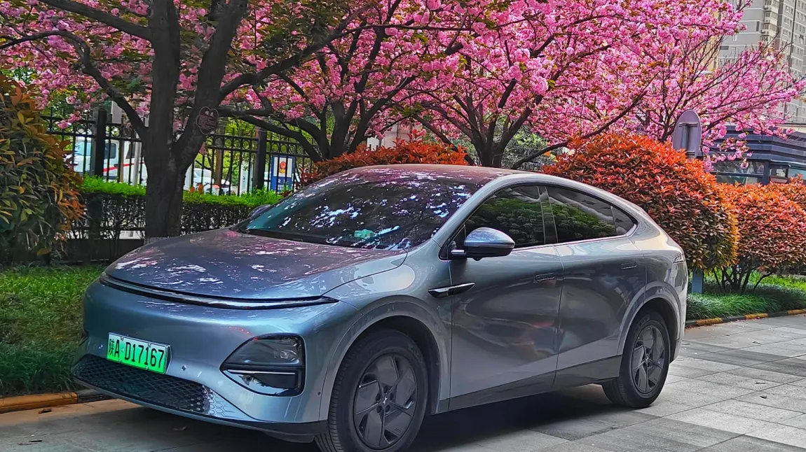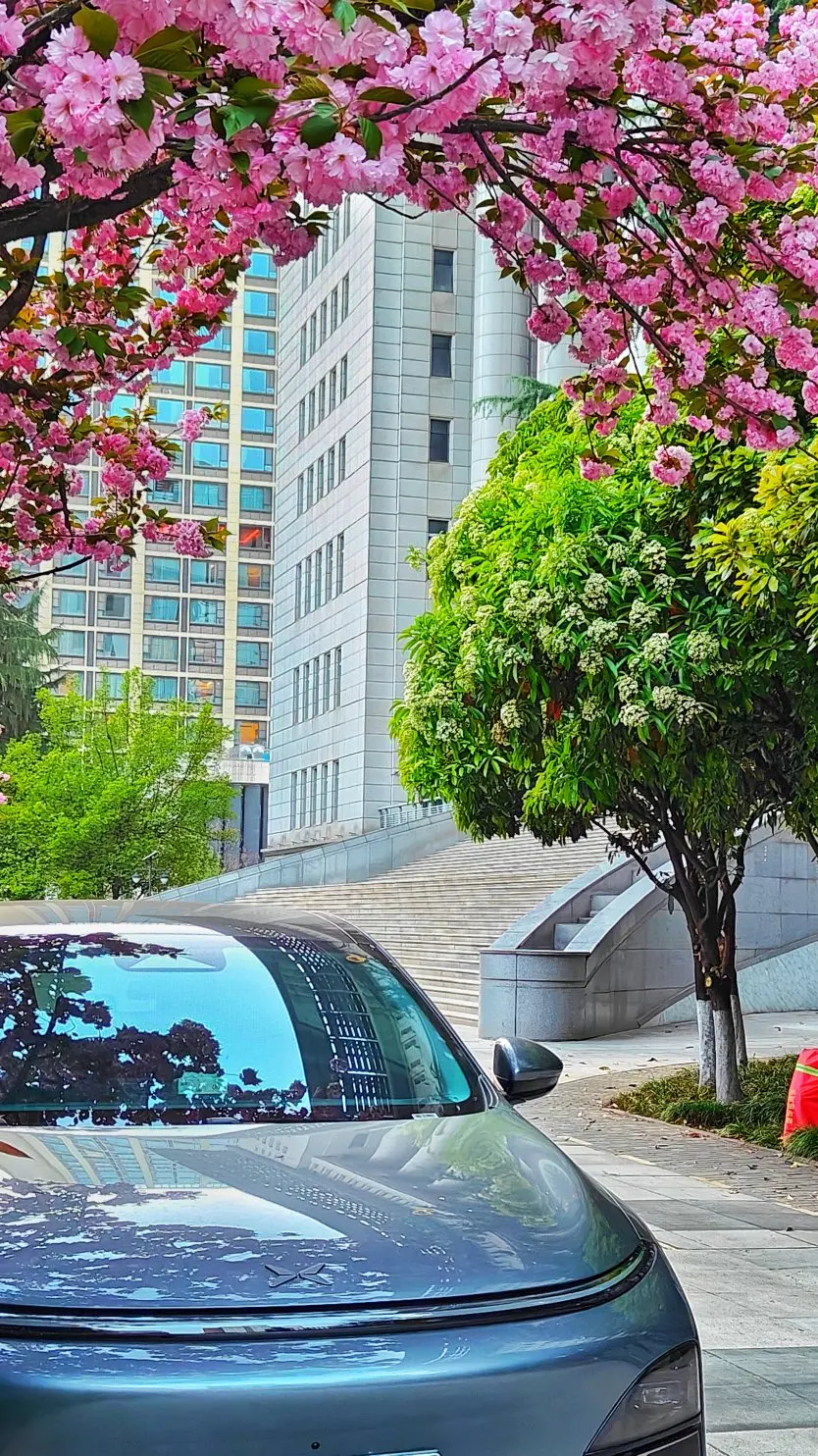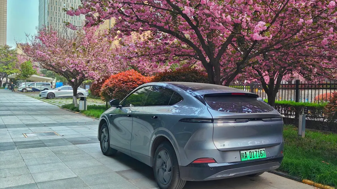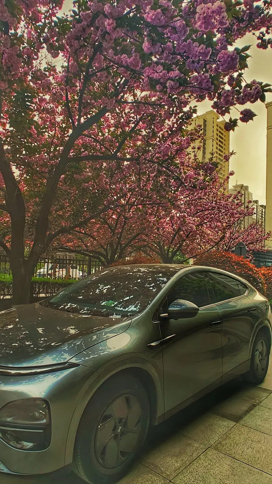 春日里,小鹏友静栖樱粉间,花影斑驳,春意与科技共舞。