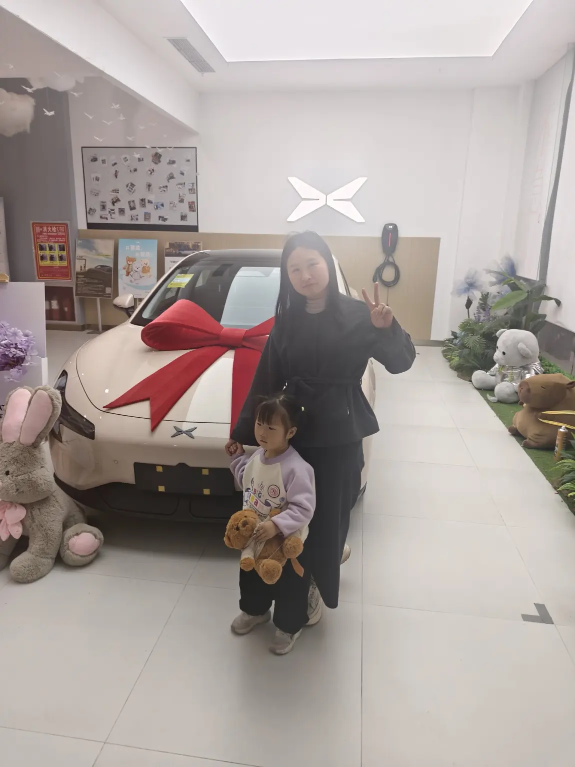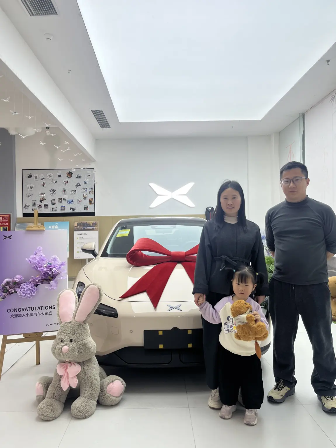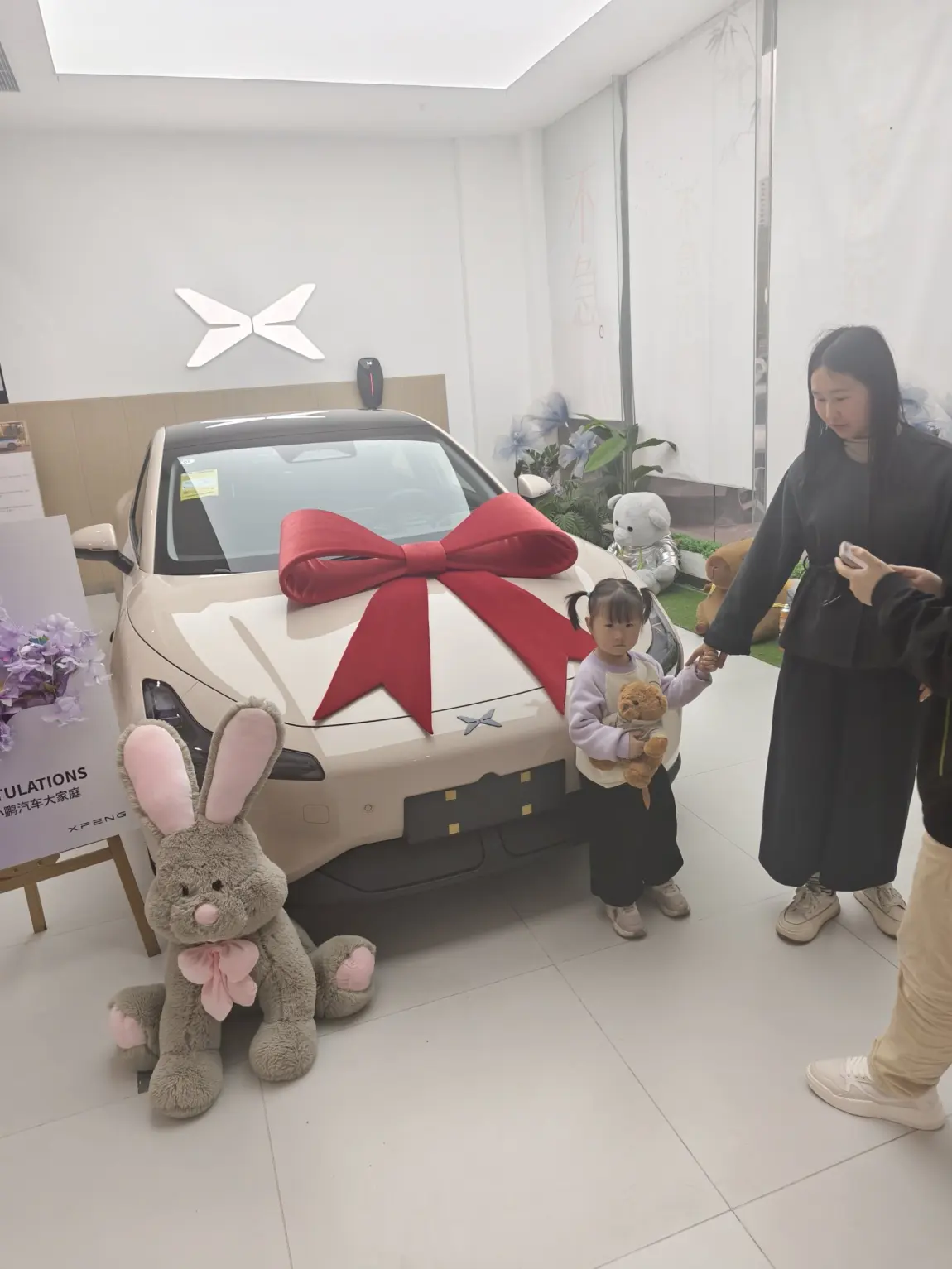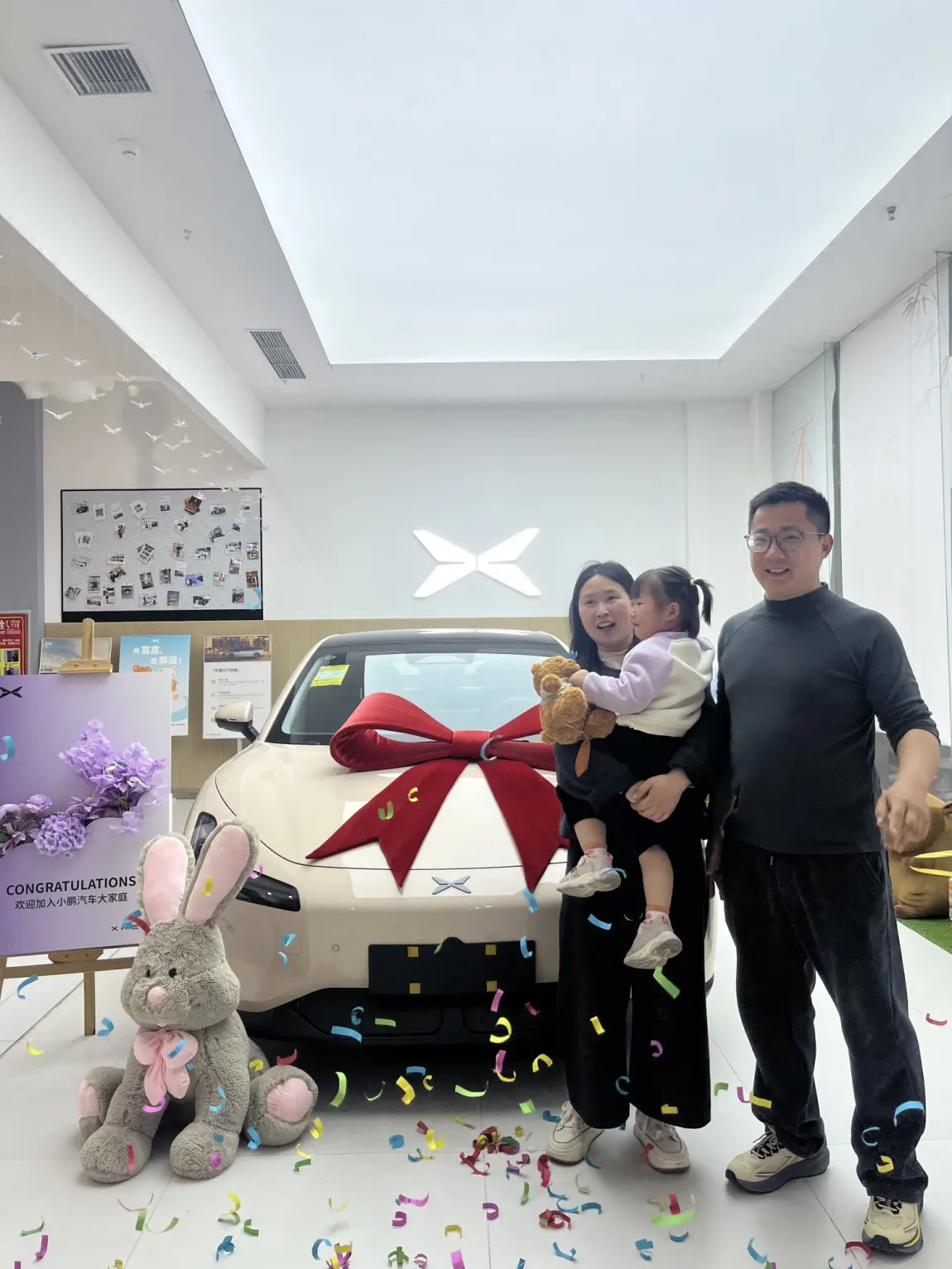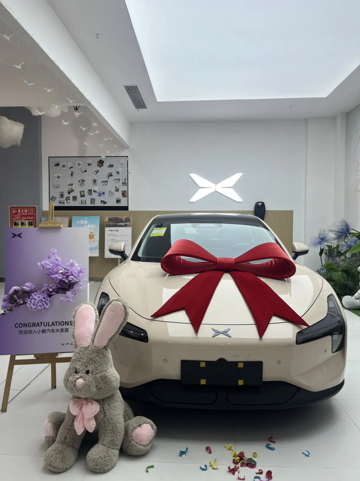 #我的提车作业# 今天是个特别的日子——终于提到了心心念念的小鹏M03,一进店就被眼前的热闹氛围感染了:新车系着大红色蝴蝶结,引擎盖在展厅灯光下泛着柔和的光泽,地上散落着彩色彩带,旁边灰色兔子玩偶歪着头,仿佛在说“欢迎回家”。