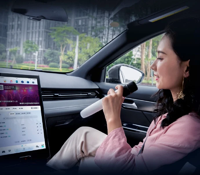这是在小鹏G3里惬意K歌的美好时刻。车内大屏界面清晰呈现,搭配专业麦克风,打造出移动KTV空间。女士神情投入,窗外绿意盎然的城市街景相映成趣,智能科技让出行时光变得轻松又有趣。哈哈