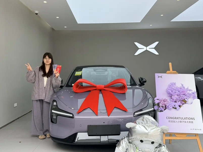 #我的提车作业# 成为何小鹏的女人啦,mona03的首任车主,听销售说我是丽水市第一个提车的哈哈哈哈,提车流程很顺利,也非常好开,小熊盲盒抽到了喜欢的颜色,设置了彩色氛围灯可喜欢的,比之前家里的油车好开太多了
