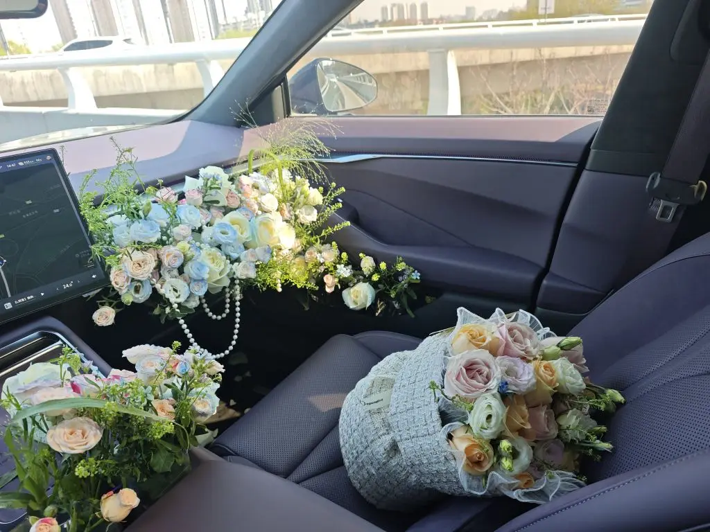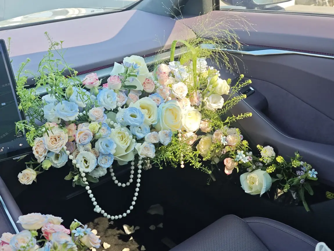 我在三处布置了鲜花,手套箱、水杯架、副驾门板。P7的储物空间还是挺大的,我用了整整5块花泥才铺满,中间花了整整两个小时,我选择了碎冰蓝玫瑰和洋桔梗所搭配,再点缀点。喷泉草和白玫瑰,最后的成品效果还是挺好看的呀。