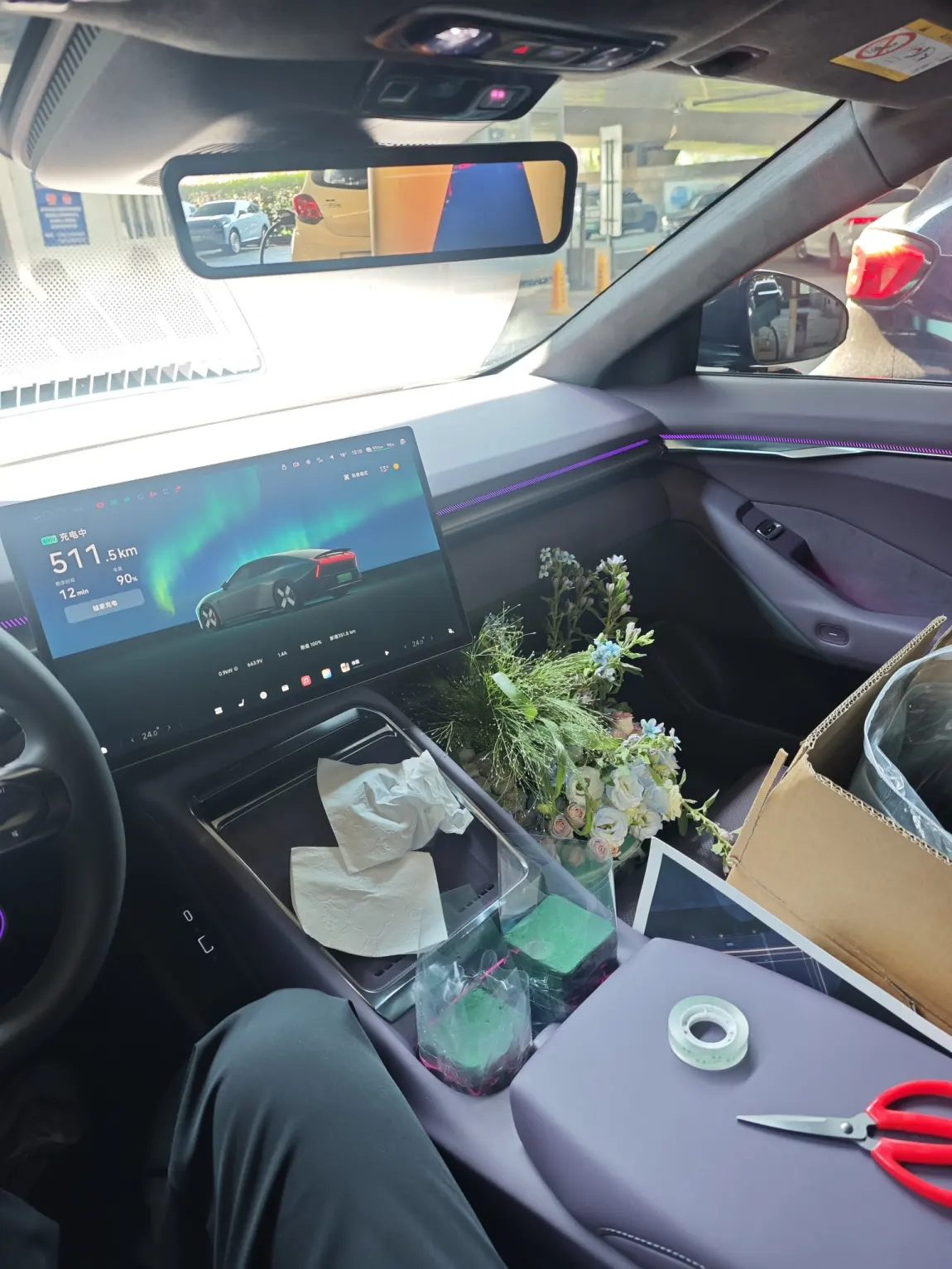 PS:全新小鹏P7的这个紫内饰,和鲜花搭配起来超级好看,我还DIY了智慧场景,氛围灯的点缀和小P的播报,让爱意更多了一份浪漫。
